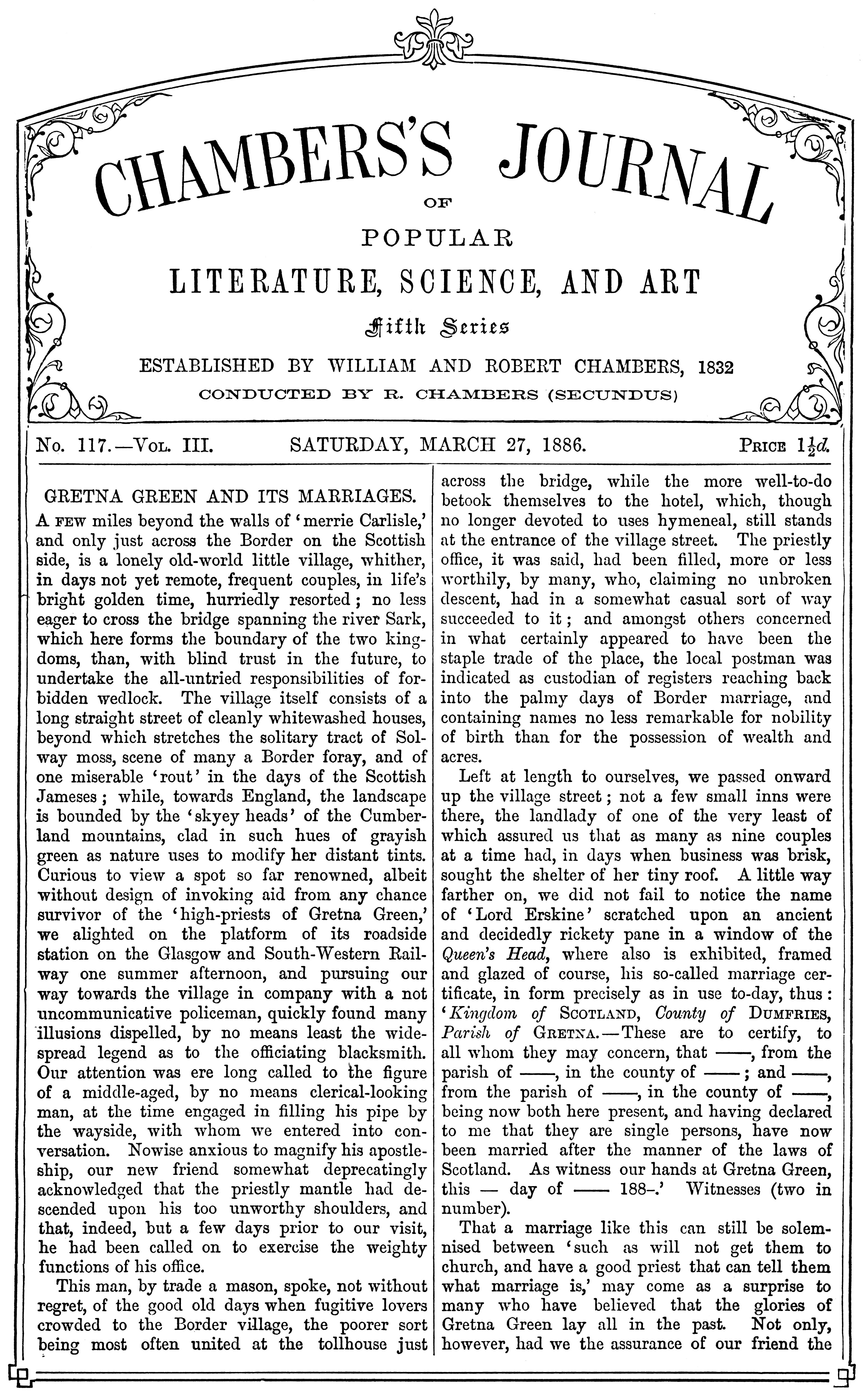 We doubt not, however, that many of our readers may learn with surprise that, even now, marriage—provided that one or other of the parties have resided three weeks in Scotland—may be thus speedily and effectually performed at the erstwhile notorious little village of Gretna Green, as well as elsewhere north of the Border.
