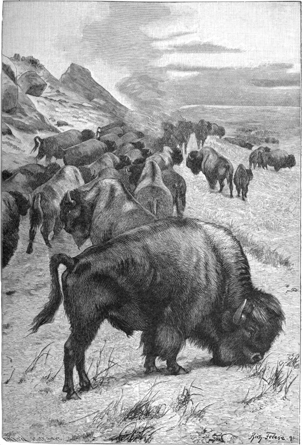 In regard to the migration of the bison or buffalo, Mr. G. B. Grinnell writes:—“It was once thought that the buffalo performed annually extensive migrations, and it was even said that those which spent the summer on the banks of the Saskatchewan wintered in Texas. There is no reason for believing this to have been true. Undoubtedly there were slight general movements north and south, and east and west, at[Pg 580] certain seasons of the year; but many of the accounts of these movements are entirely misleading, because grossly exaggerated. In one portion of the northern country I know that there was a decided east-and-west seasonal migration, the herds tending in spring away from the mountains, while in the autumn they worked back again, seeking shelter in the rough, broken country of the foot-hills from the cold west winds of the winter.”—American Big-Game Hunting (Boone and Crockett Club), edited by Theodore Roosevelt and George Bird Grinnell, Edin., 1893.