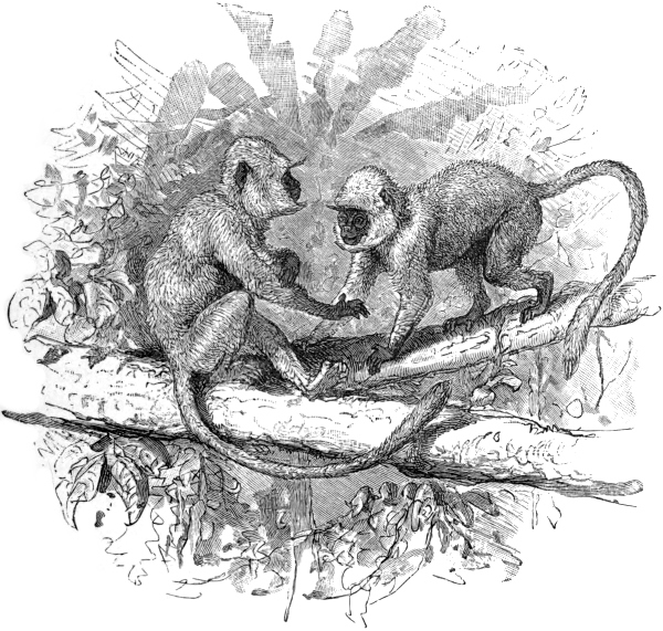 Hanumân, the sacred Hindoo long-tailed monkey, plays an important part in Hindoo mythology. He was the friend of Vishnu during his incarnation as Rama Chandra, and he aided the god greatly in the search for his wife Sita, who had been carried off by Ravān. A female slave, who had tended Sita kindly during her captivity, was married to Hanumân as a reward, and this pair some Indian noble families proudly claim as ancestors.