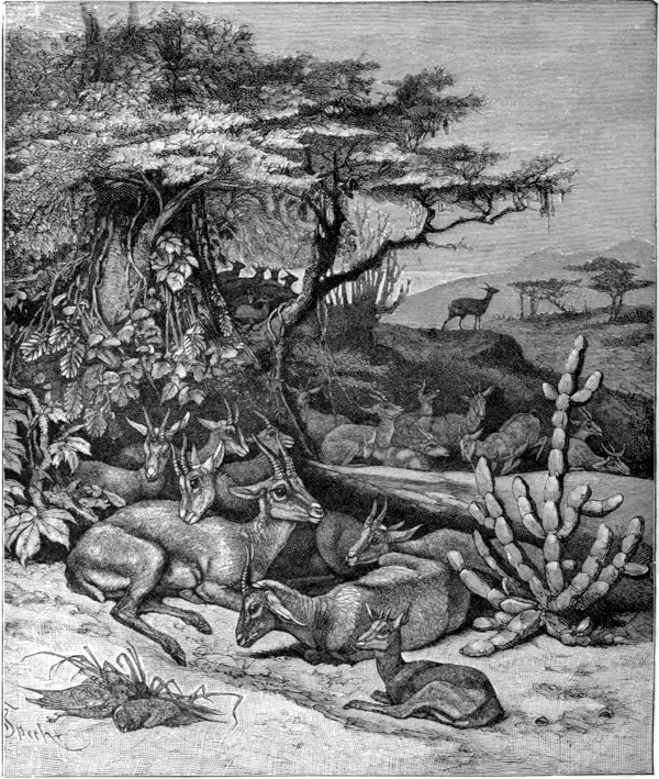 “I beheld the plains and even the hillsides which stretched on every side of me thickly covered, not with herds, but with one vast mass of springboks; as far as the eye could strain the landscape was alive with them, until they softened down into a dim red mass of living creatures. To endeavour to form any idea of the number of antelopes which I had that day beheld were vain, but I have no hesitation in saying that some hundreds of thousands were within the compass of my vision.”—Gordon Cumming. With this should be compared what other sportsmen and travellers have in recent years told us of rapidly diminishing numbers.