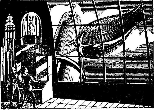 He turned a square box at the sky and set it going. Black Morgan's ship came swooping down, to stand above the observation dome of the building, its rifles trained on the men inside. Jeffries turned dials and the turret turned slowly. He manipulated another dial and the big ship turned to face away. Then it receded and was gone in a twinkling of an eye.