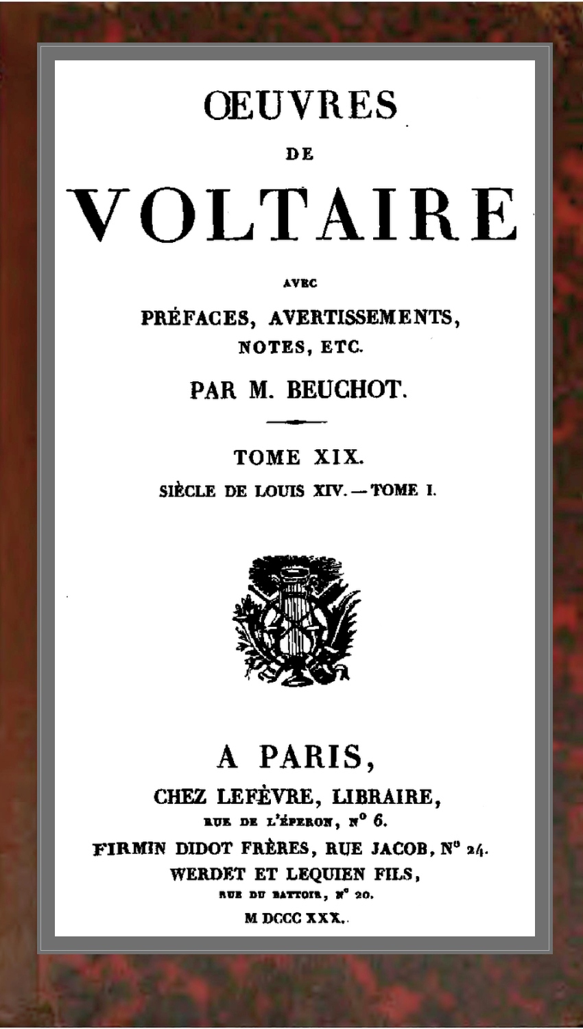 Je donne peu de variantes: il n’était nécessaire ni de les relever toutes, ni d’indiquer à quelle place se trouvaient, dans les premières éditions du Siècle de Louis XIV, des alinéa qui ont, depuis, été transportés dans l’Essai sur les mœurs.