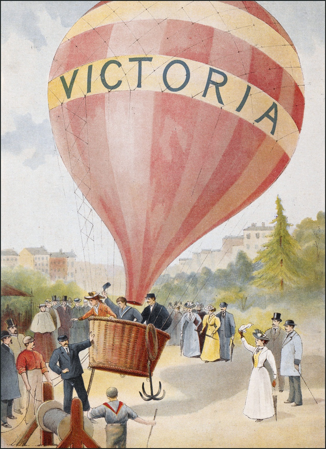 —En ballon!... Maman n’avait pas voulu nous accompagner, et nous étions seuls avec papa, pour monter dans la nacelle. Maman nous saluait avec son mouchoir en guise de drapeau. Il y avait beaucoup de monde réuni pour voir notre ascension. L’aérostat était superbe, tout rouge avec une grande bande jaune sur laquelle on lisait: Victoria! c’est-à-dire: Victoire! Je me souviens de tous ces détails comme si c’était la vérité; et au moment où papa criait: «Lâchez tout» et où nous allions nous élever dans les airs, j’ai ouvert les yeux dans mon petit lit.