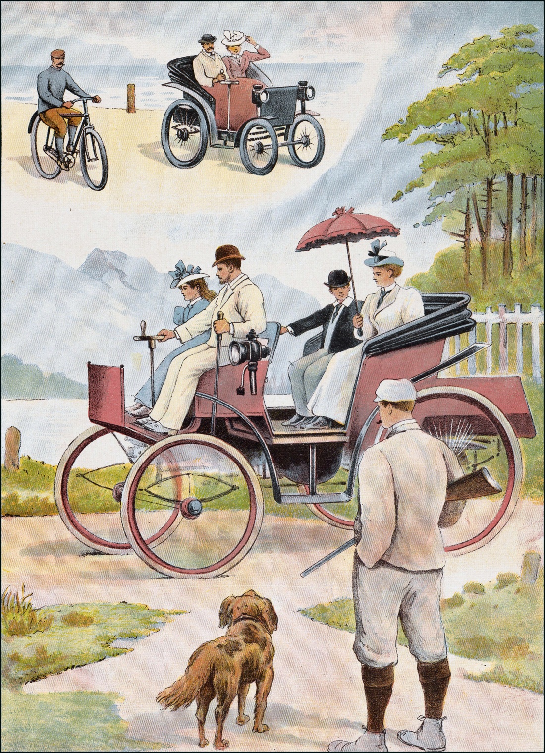 D’autres fois les voyageurs et leurs hôtes, tantôt dans des automobiles, tantôt à bicyclette, entreprenaient de visiter un peu les environs, en se gardant toutefois des trop grandes montées, qui eussent faussé le mécanisme des voitures.