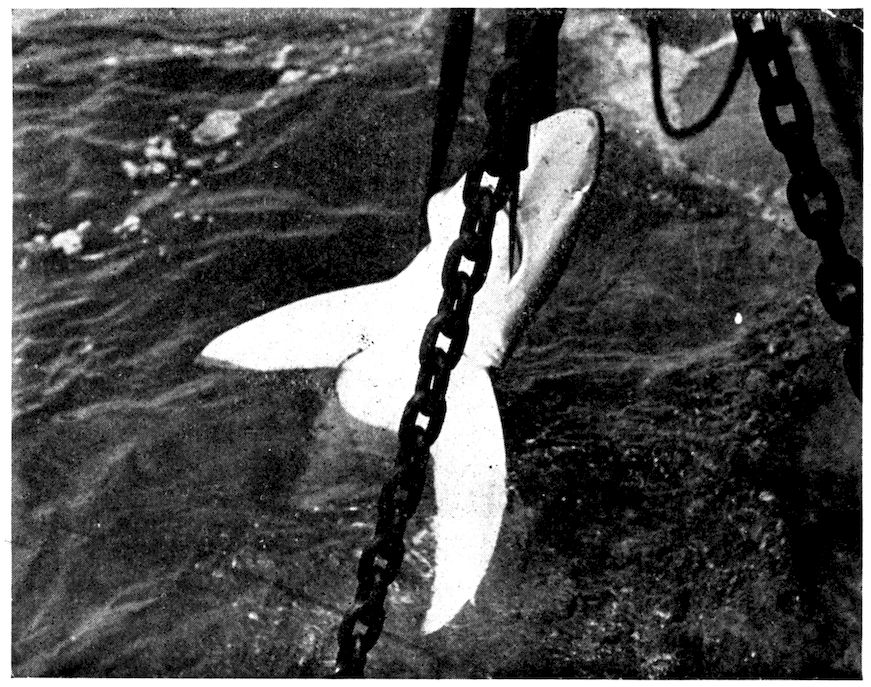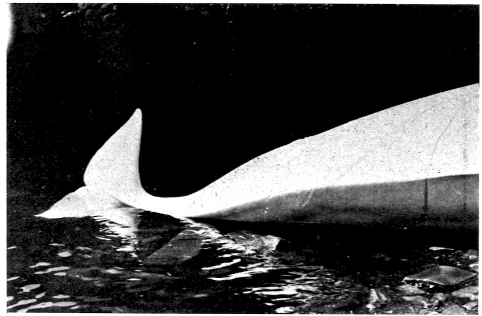 When any creature becomes aquatic it must necessarily develop means for progression through the water, and thus the caudal portion of the whale’s body by degrees expanded into the wide, flat, boneless tail, or flukes. But instead of being vertical to the axis of the body like the tail of a fish, the whale’s flukes are horizontal, obviously to give the animal greater facility in rising to the surface to breathe.