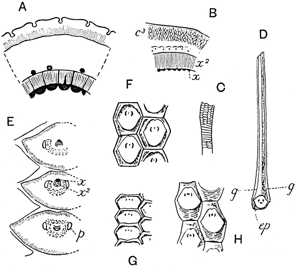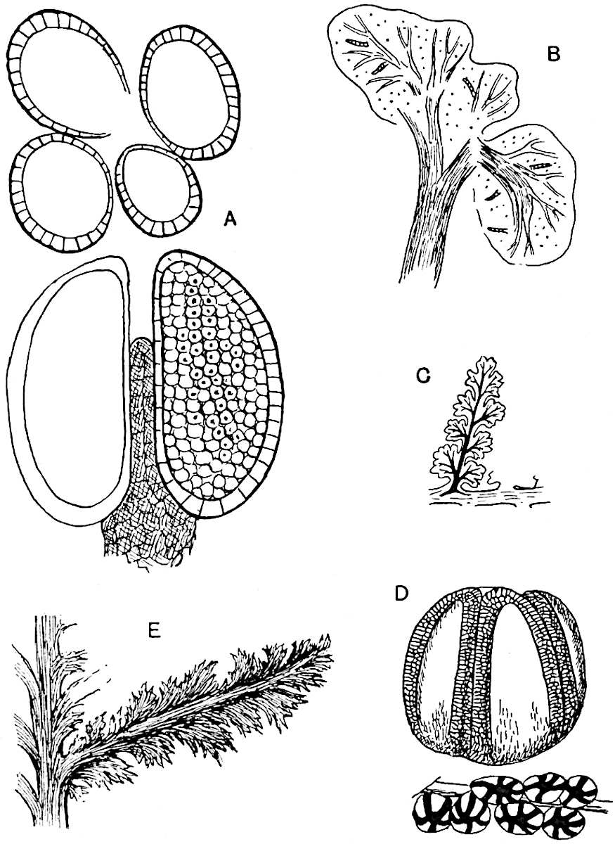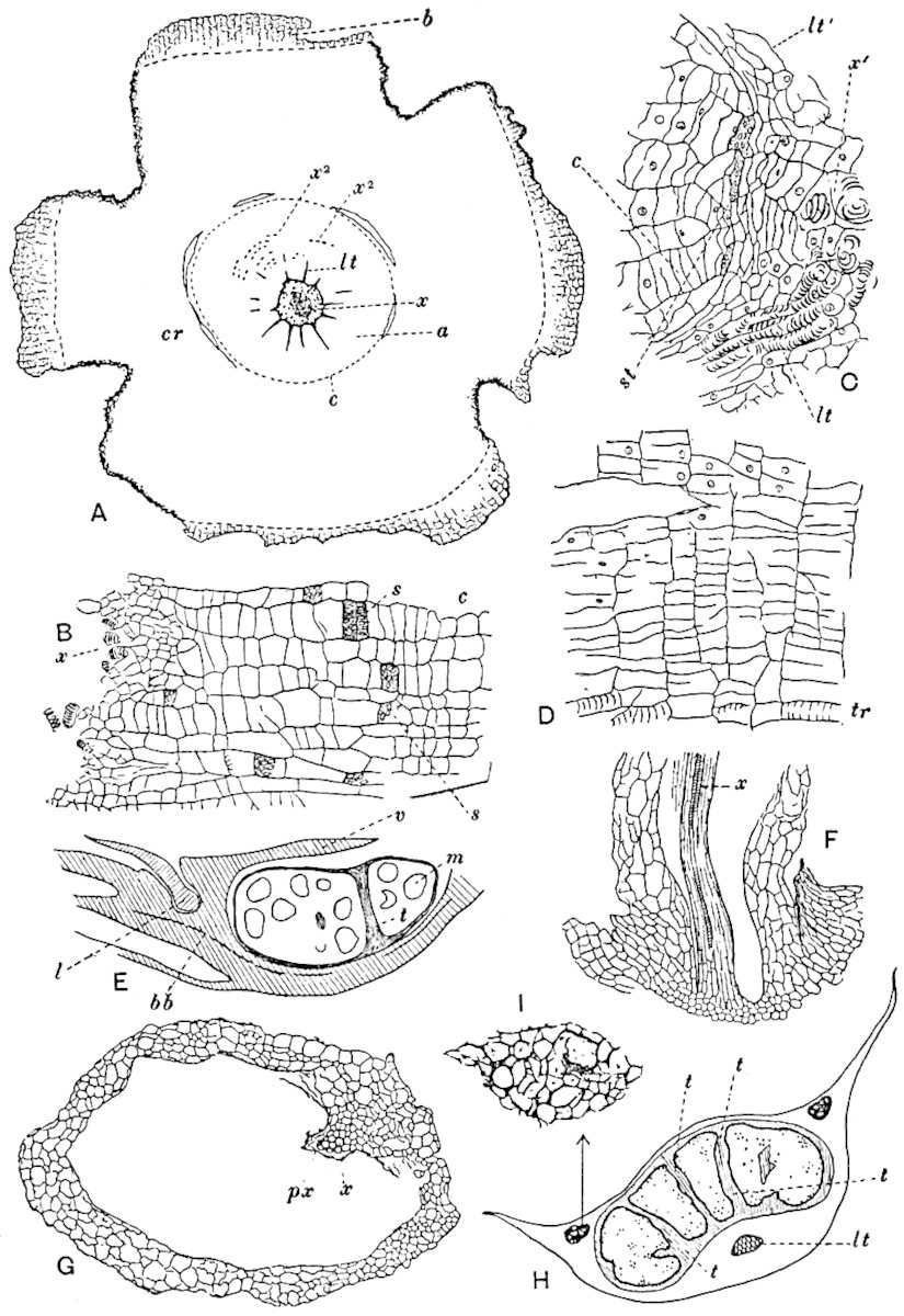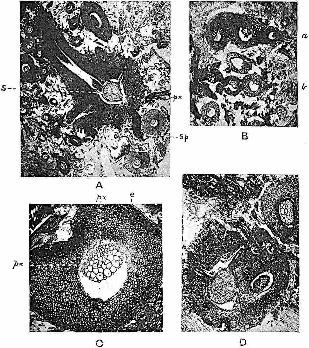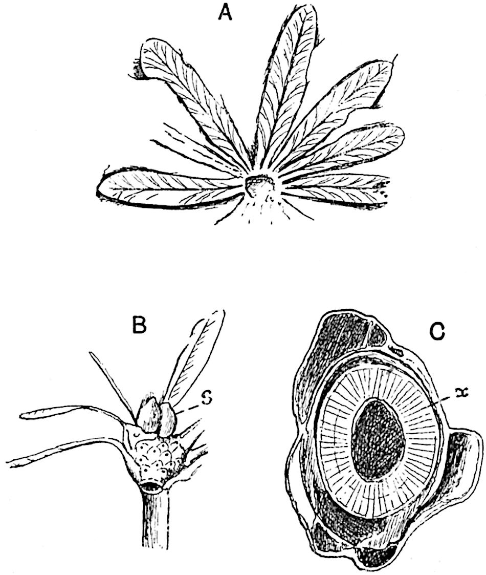 I wish to thank my colleague, Mr A. G. Tansley, for placing at my disposal several blocks originally published in the pages of the New Phytologist. To Professor Bertrand of Lille and to his son Dr Paul Bertrand I am indebted for several prints andvii descriptive notes of specimens in their possession. My friends Dr Nathorst of Stockholm and Dr Zeiller of Paris have generously responded to my requests for information on various points. I wish especially to thank Dr Kidston for several excellent prints of specimens in his collection and for the loan of sections. I have profited by more than one examination of his splendid collection at Stirling. Professor Weiss has generously allowed me to borrow sections from the Manchester University collections, more especially several which have been reproduced in the chapter devoted to the genus Lepidodendron. To Professor F. W. Oliver my thanks are due for the loan of sections from the collection under his charge at University College. I have pleasure also in thanking Dr Scott, not only for lending me sections of a Lepidodendron and for allowing me to use some drawings of Miadesmia originally made by Mrs Scott for reproduction in his invaluable book, Studies in Fossil Botany, but for kindly undertaking the laborious task of reading the proofs of this volume. It would be unfair to express my gratitude to Dr Scott for many helpful suggestions and criticisms, without explicitly stating that thanks to a friend for reading proofs must not be interpreted as an attempt to claim his support for all statements or views expressed. The General Editor of the Series, Mr A. E. Shipley, has also kindly read the proofs. I am under obligations also for assistance of various kinds to Prof. Thomas of Auckland, New Zealand, to Mr Boodle of Kew, to Mr D. M. S. Watson of Manchester, to Mr T. G. Hill of University College, and to Mr Gordon of Emmanuel College, Cambridge. I am indebted to the kind offices of Miss M. C. Knowles for the photograph of the specimen of Archaeopteris hibernica in the Irish National Museum, Dublin, reproduced on page 561.