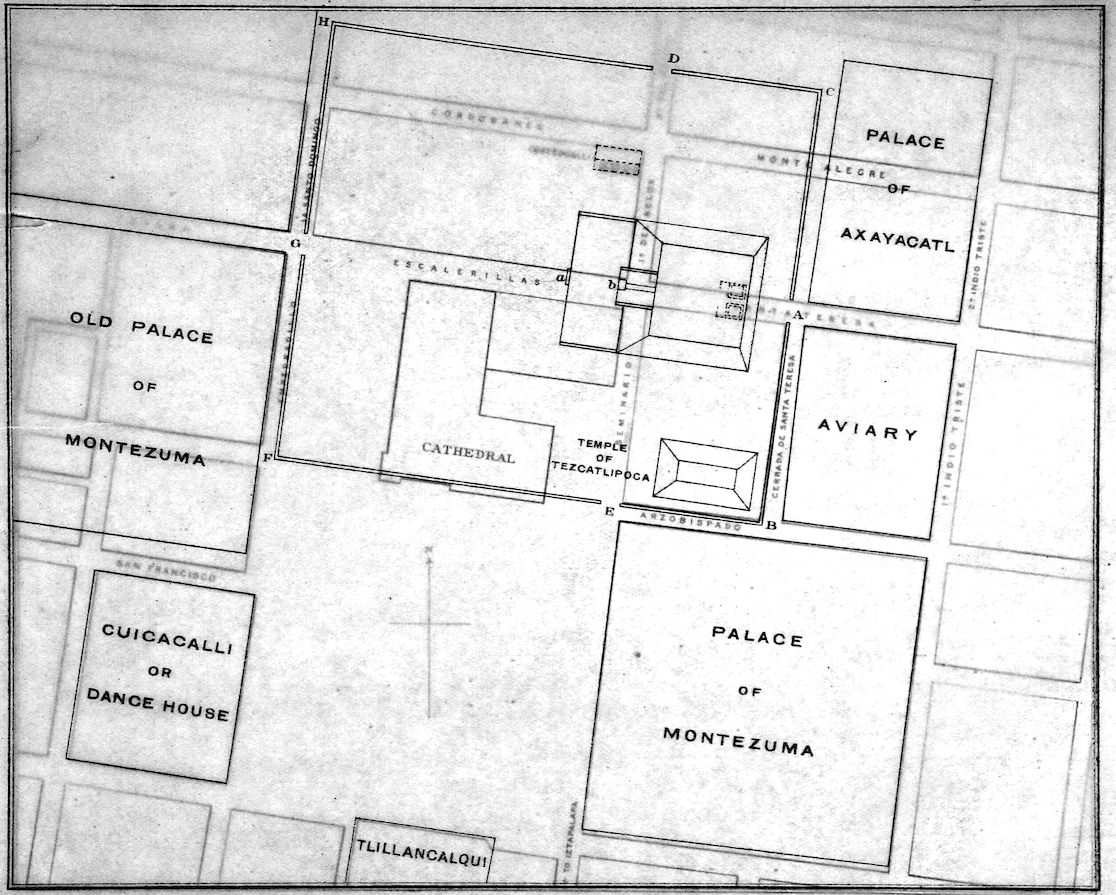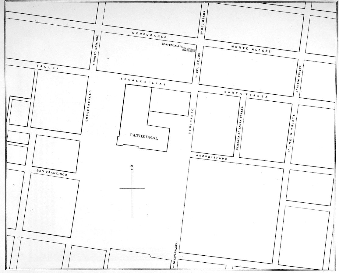 “We must now fix the site occupied by the famous Temple of Huichilopochtli[4]. As I have stated above, on the Southern side it formed the continuation of the line from the side walk (acera) of the Arzobispado towards the Alcaiceria touching the front of the present Cathedral. On the West it ran fronting the old Palace of Montezuma, with the street now called the Calle del Empedradillo (and formerly called the Plazuela del Marques del Valle) between them, but on the East and North it extended far beyond the square formed by the Cathedral and Seminario, and in the 6first of these directions reached the Calle Cerrada de Sta. Teresa, and followed the direction of this last until it met that of the Ensenanza now the Calle Cordobanes and the Montealegre.”