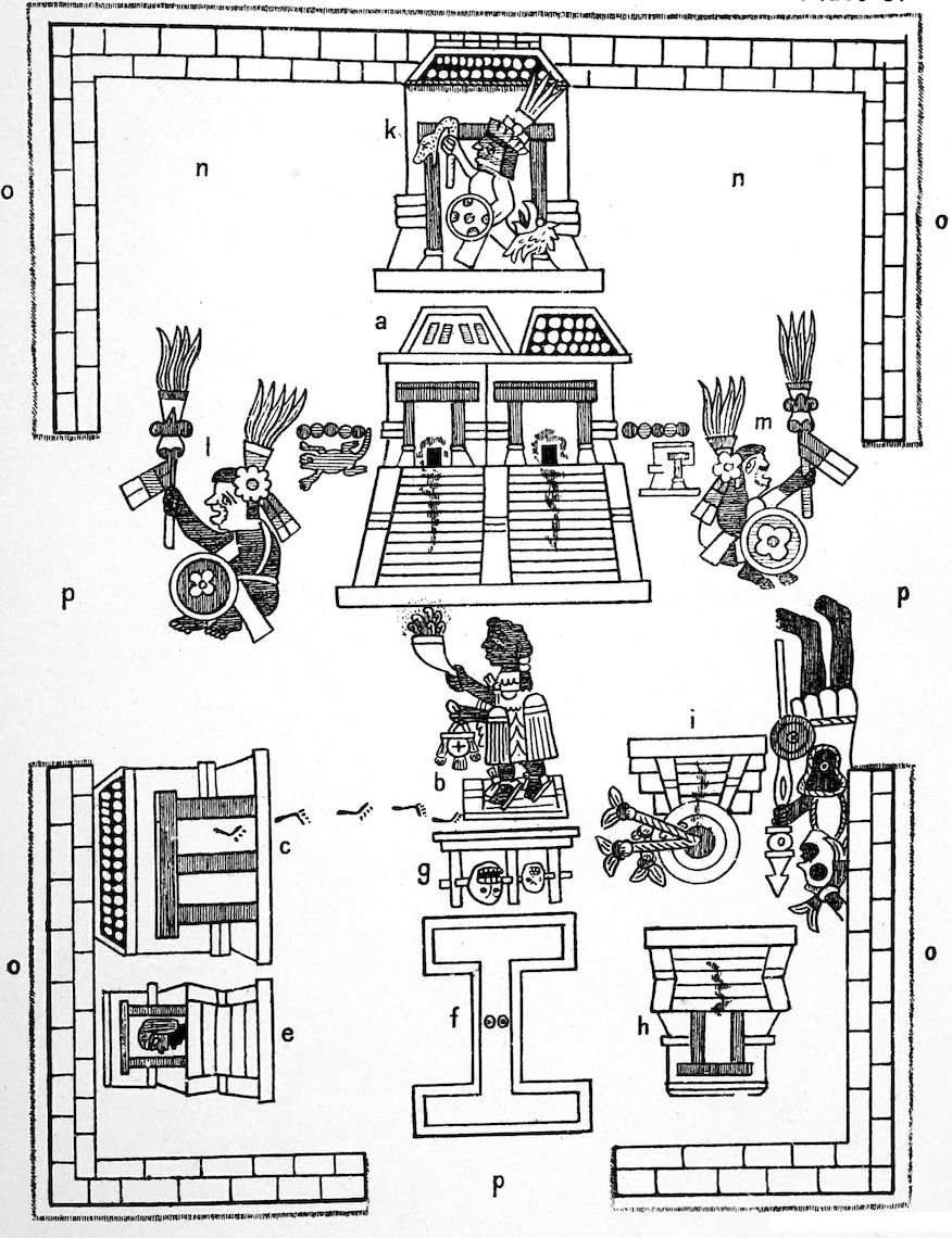 This tower was divided in the upper part, so that it looked like two, and had two chapels or altars on the top, each one covered by its dome (chapitel) and each one of them had on the summit its particular badges or devices. In the principal one of them was the statue of Vitzilopuchtli, also called Ilhuicatlxoxouhqui, and in the other the image of the God Tlaloc. Before each one of these was a round stone like a chopping-block, which they call Texcatl, where they killed those whom they sacrificed in honour of that God, and from the stone towards the ground below was a pool of blood from those killed on it; and so it was on all the other towers; these faced the West, and one ascended by very narrow straight steps to all these towers.