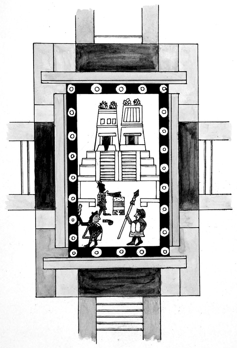 On the top, where there was a pavement and small plaza rather more than seventy feet wide, two very large altars had been built, one apart from the other, set almost at the edge or border of the tower on the east side, so that there was only just sufficient ground and space for a man to walk [on the east side] without danger of falling down from the building.