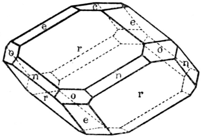 It is obviously then the “habit” which is different in the three types of calcite—Iceland spar, prismatic calc-spar, and dog-tooth spar—doubtless owing to the different local circumstances of growth of the mineral. Habit is simply the expression of the fact that a specific “form,” or possibly two particular forms, is or are much more prominently developed in one variety than in another. Thus the principal rhombohedron r = {100}, parallel to the faces of which calcite cleaves so readily, is the predominating form in Iceland spar, while the 13scalenohedron v = {20̄1} is the habit-conferring form in dog-tooth spar. Yet on the latter the rhombohedral faces are frequently developed, blunting the sharp terminations of the scalenohedra, especially in dog-tooth spar from Derbyshire or the Hartz mountains; and on the former minute faces of the scalenohedron are often found, provided the rhombohedron consists of the natural exterior faces of the crystal and not of cleavage faces. In the same manner the prismatic crystals from Egremont are characterised by two forms, the hexagonal prism m = {2̄1̄1} and the secondary rhombohedron e = {110}, but both of these forms, as we have seen on the actual crystal represented in Fig. 8, are also found developed on other crystals of mixed habit.