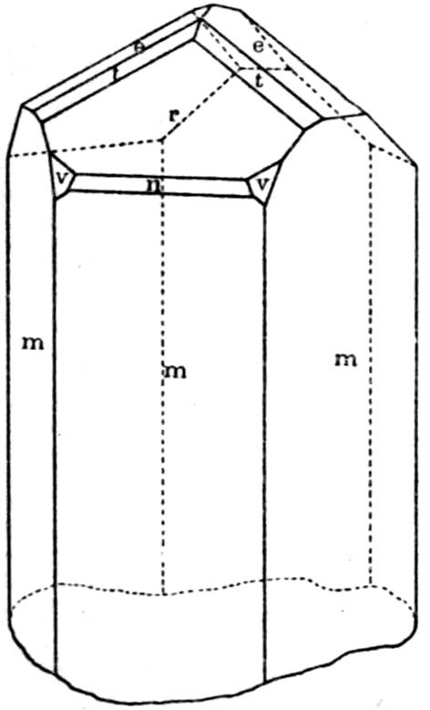 11Moreover, many of the same faces, that is, faces having the same relation to the symmetry, are present on all three varieties, the “forms” to which they equally belong being the common heritage of calcite wherever found. A “form” is the technical term for a set of faces having an equal value with respect to the symmetry. Thus the prismatic form in Fig. 6 is the hexagonal prism, a form which is common to the hexagonal and trigonal systems of symmetry, and the form “indices” (numbers[1] inversely proportional to the intercepts cut off from the crystal axes by the face typifying the form) of which are {2̄1̄1}; the large development of this form confers the elongated prismatic habit on the crystal. The terminations are faces of the flat rhombohedron {110}. The pyramidal form of the dog-tooth spar shown in Fig. 7 is the scalenohedron {20̄1}, and it is this form which confers the tooth-like habit, so different from the hexagonal prism, upon this variety of calcite. But many specimens of dog-tooth spar, notably those from Derbyshire, consist of scalenohedra the middle portion of which is replaced by faces of the hexagonal prism {2̄1̄1}, and the terminations of which are replaced by 12the characteristic rhombohedron {100} of Iceland spar; indeed, it is quite common to find crystals of calcite exhibiting on the same individual all the forms which have been mentioned, that is, those dominating the three very differently appearing types. The author has quite recently measured such a crystal, which, besides showing all these four forms well developed, also exhibited the faces of two others of the well-known forms of calcite, {3̄1̄1} and {310}, and a reproduction of a drawing of it to scale is given in Fig. 8. Instead of indices the faces of each form bear a distinctive letter; m = {2̄1̄1}, r = {100}, e = {110}, v = {20̄1} (the faces of the scalenohedron are of somewhat small dimensions on this crystal), n = {3̄1̄1}, and t = {310}.