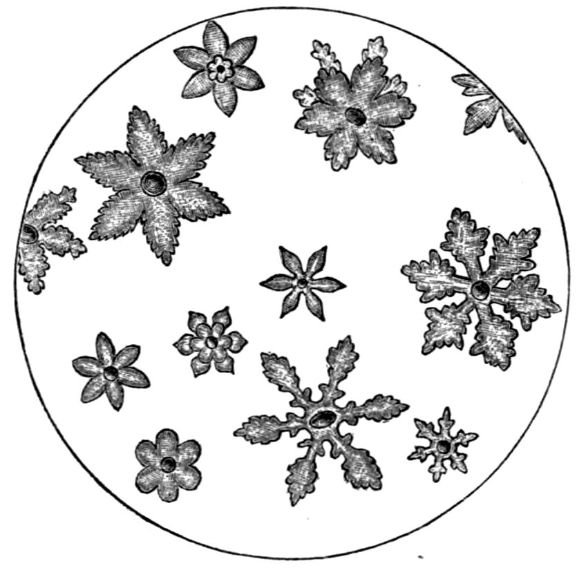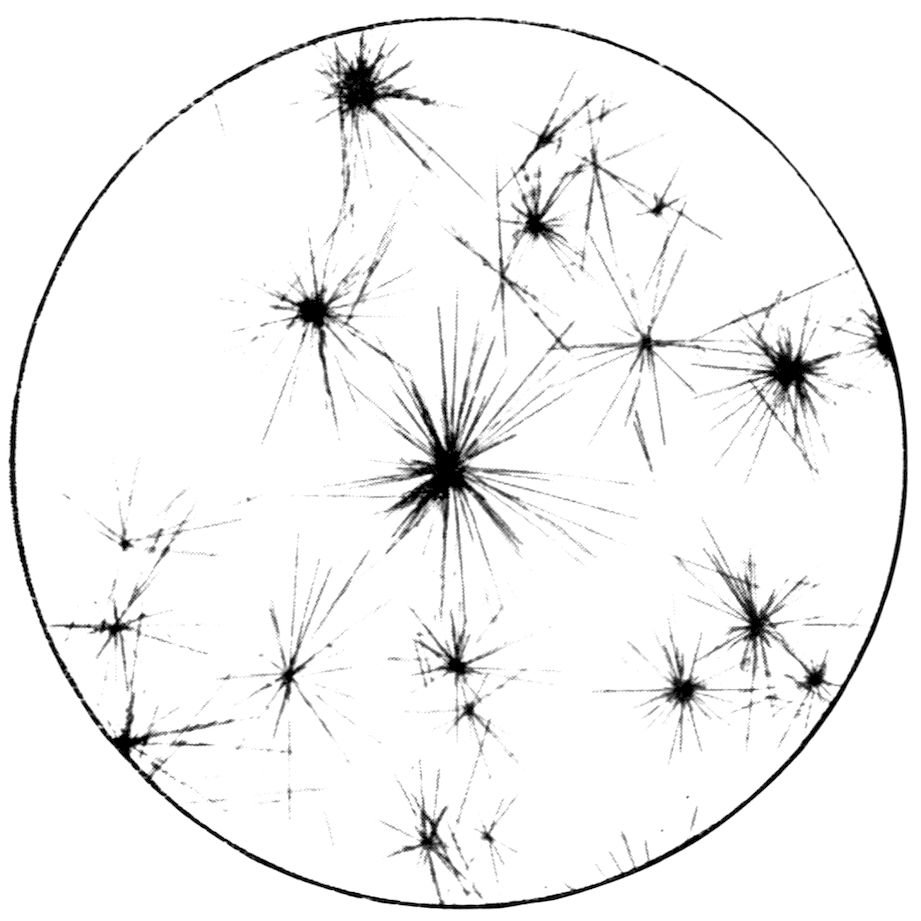 Or again, the crystal may have been deposited from the state of solution in a solvent, in which case it is a question of the passage of the substance from the liquid to the solid condition, complicated by the presence of the molecules of the solvent, from which the molecules of the crystallising solid have to effect their escape. Fig. 4 (Plate II.) represents crystals of potash alum, for instance, growing from a drop of saturated solution on a glass slip placed on the stage of the microscope, the drop being spread within a hard ring of gold size and under a cover-glass, in order to prevent rapid evaporation and avoid apparent distortion by the curvature of an uncovered drop. The crystals are of octahedral habit like those of oxide of arsenic, but many of them also exhibit the faces of the cube.