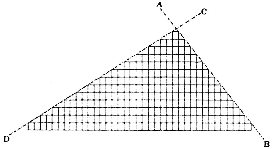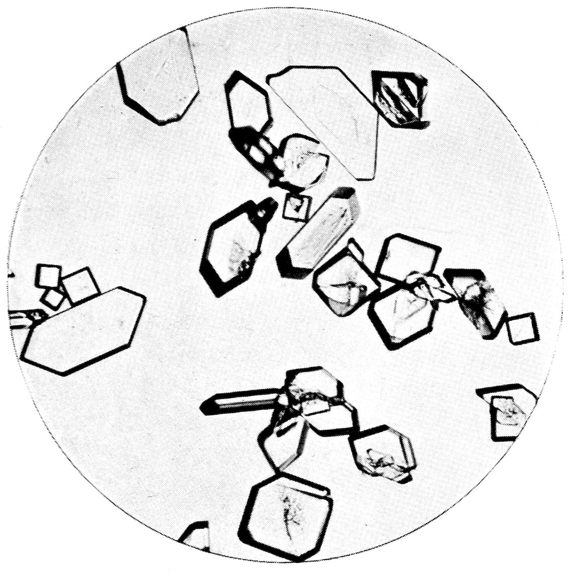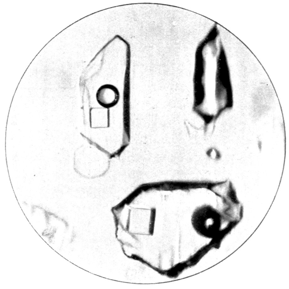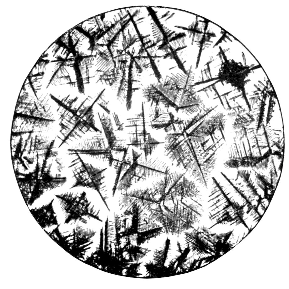 5Or the substance may be one which passes directly from the gaseous to the solid condition, on the cooling of the vapour from a temperature higher than the ordinary down to the latter, under atmospheric pressure. Oxide of arsenic, As2O3, is a substance exhibiting this property characteristically, and Fig. 3 (Plate I.) is a reproduction of a photograph of crystals of this substance thus produced. The white solid oxide was heated in a short test tube over a Bunsen flame, and the vapour produced was allowed to condense on a microscope glass slip, and the result examined under the microscope, using a 1½ inch objective. Fig. 3 represents a characteristic field of the transparent octahedral crystals.