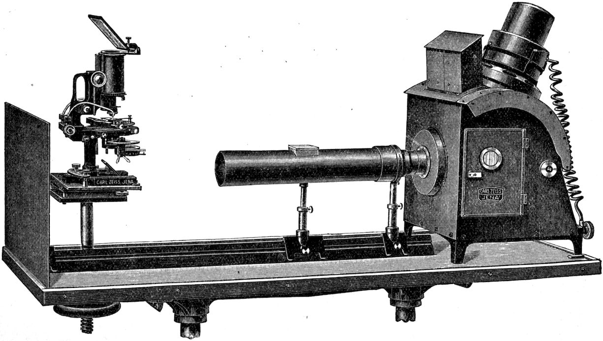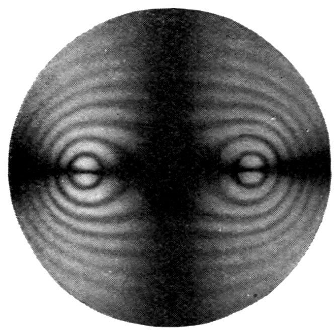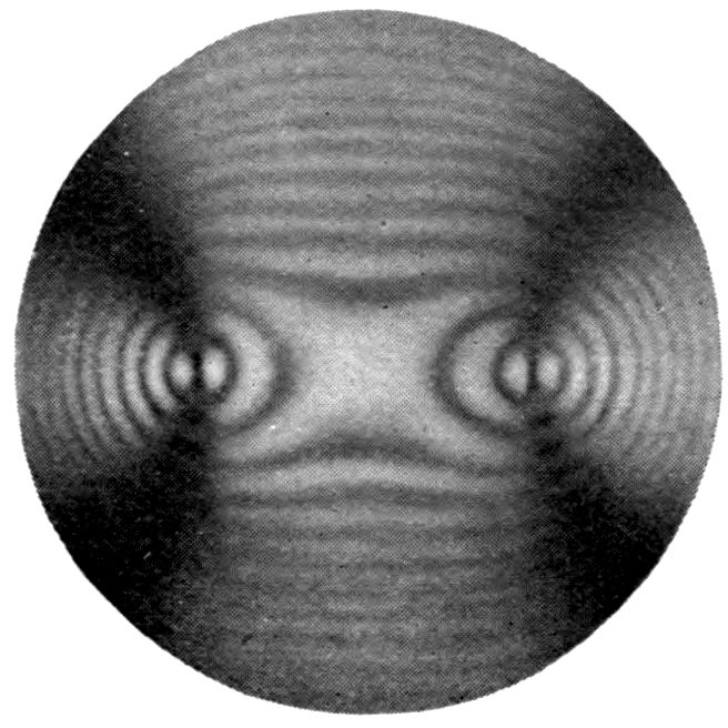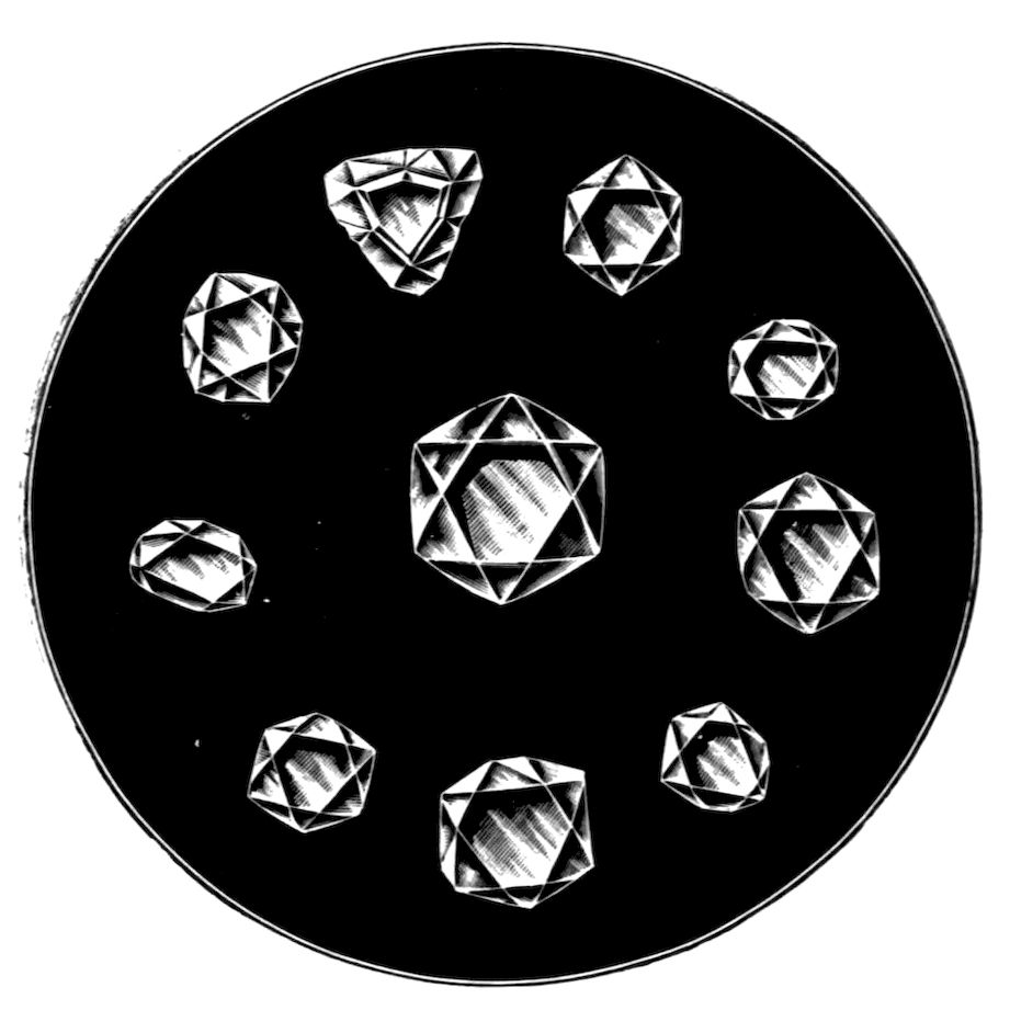 An interesting and very beautiful lecture experiment was performed by the author in a lecture a few years ago at the Royal Institution, which illustrated in a striking manner this fact that the light reaching the eye from a crystal is of two kinds, namely, white light reflected from the exterior faces and coloured light which has penetrated the crystal substance and emerges refracted and dispersed as spectra. Two powerful beams of light from a pair of widely separated electric lanterns were concentrated on a cluster of magnificent large diamonds, kindly lent for the purpose by Mr Edwin Streeter, and arranged in the shape of a crown, it being about the time of the Coronation of His late Majesty King Edward VII. The effect was not only to produce a blaze of colour about the diamonds themselves, but also to project upon the 9ceiling of the lecture theatre numerous images in white light of the poles of the electric arc, derived by reflection from the facets, interspersed with equally numerous coloured spectra derived from rays which had penetrated the substance of the diamonds, and had suffered both refraction and internal reflection.