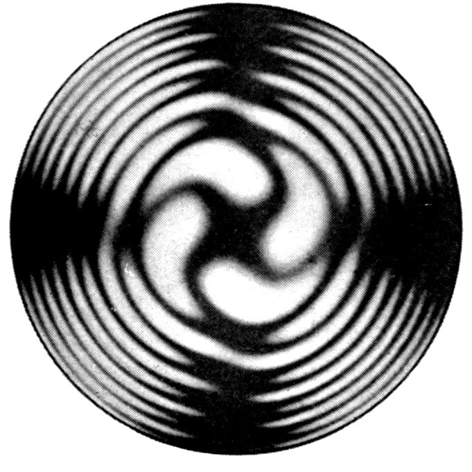 Fig. 90.—Screen Picture in Polarised Light, with Nicols crossed, of a thick Plate perpendicular to the Axis of a naturally twinned Crystal of Quartz, the left half being of right-handed Quartz and the right half of alternately left and right-handed Quartz, the Planes of Demarcation being oblique to the Plate.