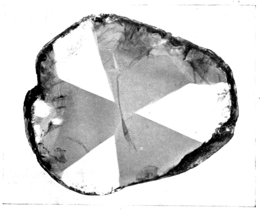 A crystal of quartz, rock-crystal, for instance—detached, during the course of the disintegration of the granitic rock of which it had originally formed an individual crystal, by the denuding influences at work in nature thousands of years ago, subsequently knocked about the world as a rounded sand grain, blown over deserts by the wind, its corners rounded off by rude contact with its fellows, and subjected to every variety of rough treatment—may eventually in our own day find itself in water containing in solution a small amount of the material of which quartz is composed, silicon dioxide SiO2. No sooner is this favourable environment for continuing its crystallisation presented to it, than, however old it may be, it begins to sprout and grow again. It becomes surrounded in all probability by a beautiful coating of transparent quartz, with exterior faces inclined at the exact angles of quartz, although no sign of exterior faces had hitherto persisted through all the stages of its varied adventures. Or it may grow chiefly at two or three especially favourable places, and in the course of a few weeks, under suitable conditions, at each place a perfect little quartz crystal will radiate out from the sand grain, composed of a miniature hexagonal prism terminated by the well-known pyramid, really consisting of a pair of 3trigonal (rhombohedral) pyramids more or less equally developed, and together producing an apparently hexagonal one. Four such grains of sand, from which quartz crystals are growing, are shown in Fig. 1, as they appear under a microscope magnifying about fifty diameters. One of them shows a perfectly developed doubly terminated crystal of quartz growing from the tip of a singly terminated one, attached to and growing directly out of the grain.