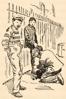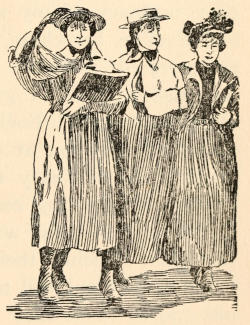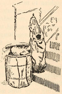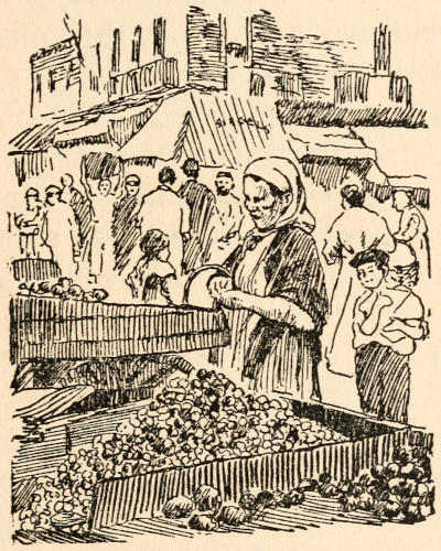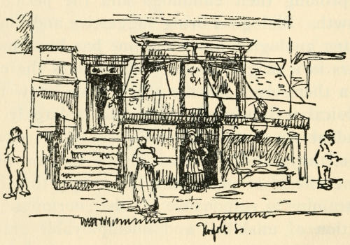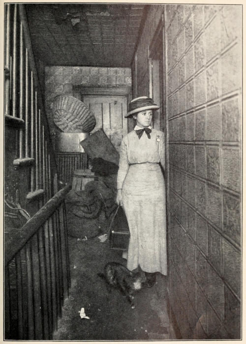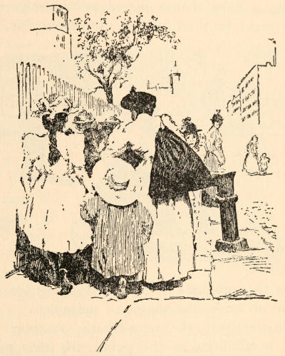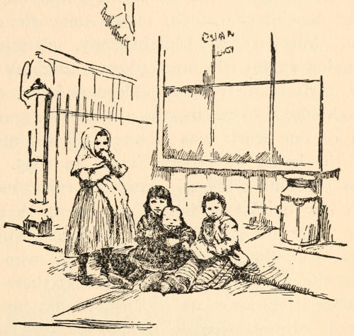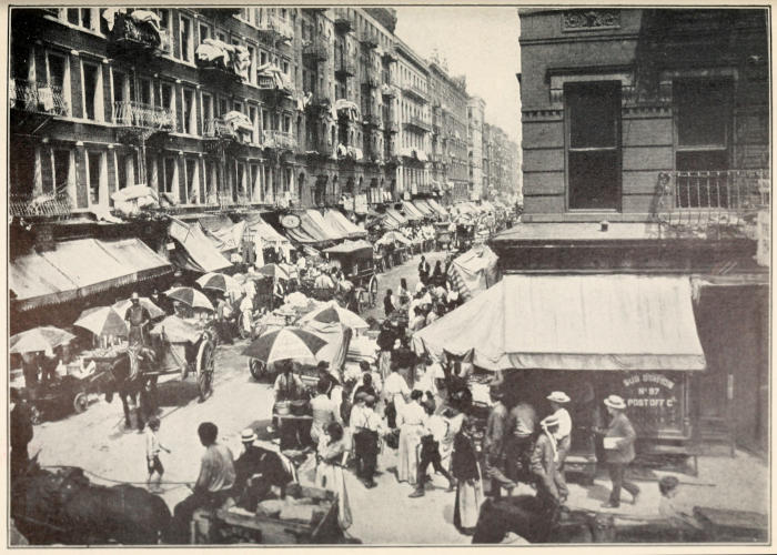 The child led me over broken roadways,—there was no asphalt, although its use was well established in other parts of the city,—over dirty mattresses and heaps of refuse,—it was before Colonel Waring had shown the possibility of clean streets even in that quarter,—between tall, reeking houses whose laden fire-escapes, useless for their appointed purpose, bulged with household goods of every description. The rain added to the dismal appearance of the streets and to the discomfort of the crowds which thronged them, intensifying the odors[5] which assailed me from every side. Through Hester and Division streets we went to the end of Ludlow; past odorous fish-stands, for the streets were a market-place, unregulated, unsupervised, unclean; past evil-smelling, uncovered garbage-cans; and—perhaps worst of all, where so many little children played—past the trucks brought down from more fastidious quarters and stalled on these already overcrowded streets, lending themselves inevitably to many forms of indecency.