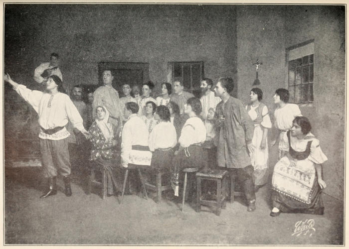 [17] The early Hebrews possessed a few mystery plays, “The Sale of Joseph,” “Esther and Haman,” and “David and Goliath,” and at the Jewish carnival of Purim (Feast of Esther) merrymakers went from house to house giving performances of song and mimicry, but the Yiddish theater is new and was first introduced in Rumania not more than thirty-five years ago. Transplanted to Russia, the actors, said to have been selected from the original strolling companies, played a brilliant brief part until, under government order, the Yiddish theaters were closed there.