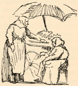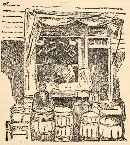 We learned the most efficient use of the fire-escape and felt many times blessed because of our easy access to the roof. We also learned the infinite uses to which stairs can be put. Later we achieved “local color” in our rooms by the addition of interesting pieces of brass and copper purchased from a man on Allen Street whom we and several others had “discovered.”[13] His little dark shop under the elevated railway was fitfully illuminated by the glowing forge. On our first visit the proprietor emerged from a still darker inner room with prayer-shawl and phylactery. He became one of our pleasant acquaintances and lost no occasion of acknowledging what he considered his debt to the appreciative customers who had helped to make him and his wares known to a wider circle than that of the neighborhood.