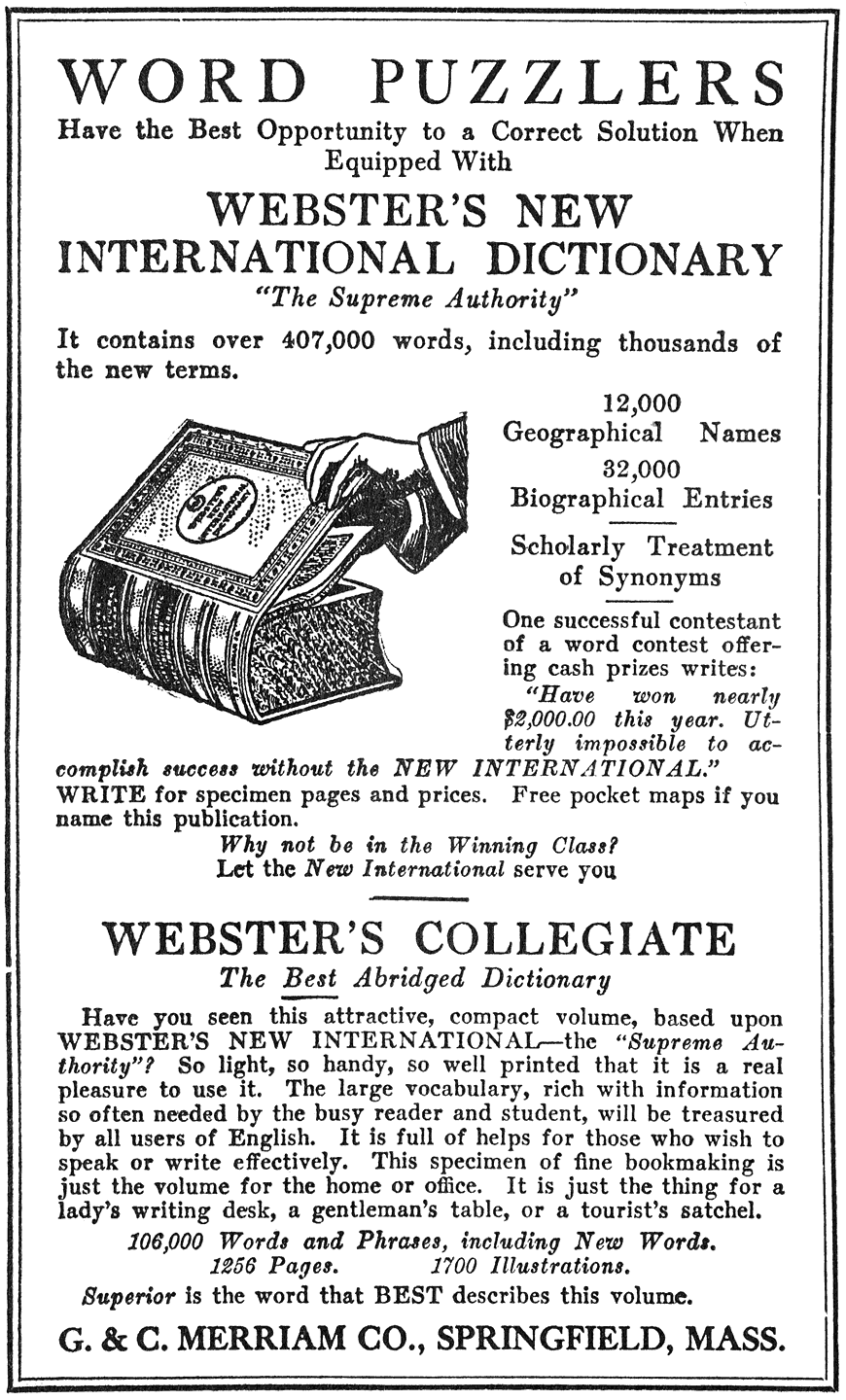 A third element enters the lists at this point—the constructors. When a man has a superb puzzle almost finished, with complete interlock and no abbreviations or unkeyed letters, he frequently finds a space left into which nothing will go except a particularly rare combination of letters—let us say, for example, TIL. The constructor runs hastily through his vocabulary and finds no TIL; he has a vague recollection of such a word somewhere in his poetic remembrances; but the familiar abbreviation of “until” is “till,” and the constructor has no wish to add the damning parenthesis-enclosed “poet. contr.” after his definition. He tries all the combinations possible; none will fit. Torn between despair and hope he seeks Webster’s Unabridged. Trembling finger runs down the columns. Ah! Between “tikur” and “tilbury,” in small type, as though ashamed of existence, he finds what he seeks. “Til—Sesame.” Into the construction goes the word, and the puzzle is finished. Observe that the constructor had no desire to introduce this exotic syllable; he did not even know that there was such a word in any language. If he could have written “tic,” or “tie,” or “tin,” or “tip,” or “tis,” or “tit,” he would have done so. But “til” was his sole refuge, and the Unabridged bore him nobly out. Thus, says the constructor, why should the solver rage when he discovers “sesame” among the definitions? Let him try to make one himself, etc., etc.