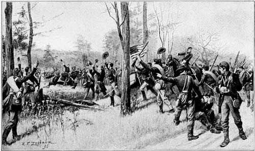 I push through the line slightly forward of the nearest brigade, and in a moment the sharp command, “Attention!” rings down the line. “Shoulder arms! Forward! March!” And with martial tread and floating flags the[187] line of battle is away. “Guide left!” shout the line-officers. “Guide left—left!” and that is the only order I hear as we press forward through the thick trees and underbrush. I lean well forward on my horse’s neck, striving to catch if possible a glimpse of the Confederate line; but hark! Here comes the first shot. “Steady! Steady, men!” Another, and now a few scattering bullets come singing through the woods. The line does not halt or return the fire, but presses steadily on to the oft-repeated command of “Forward! forward!” that never ceases to ring from one end to the other of the advancing line. Soon the woods become less dense, and through the trees I see just beyond us an open field partly covered with small bushes, and several hundred yards away, crowning a slight crest on its farther side, a low line of fence-rails and loose stones, which, as we leave the edge of the woods, and come into the open, suddenly vomits flame and smoke along its entire length, and a crashing volley tells us that we have found the enemy. For an instant our line staggers,[188] but the volley has been aimed too high and few men fall. “Steady—steady, men!” shout the officers. “Aim!” and almost instinctively the whole line throw forward their pieces. “Fire!” and the next instant a savage volley answers that of the Confederates. I can see that it has told, too, for in several places along the opposite crest men spring to their feet as if to fall back, but their officers promptly rally them. “Pour it into them, men!” shout our officers. “Let them have it. It’s our turn now!” for brute instinct has triumphed and the savage is uppermost with all of us. For a moment or two the men stand and fire at will, as rapidly as it is possible to reload, and then the Confederate fire seems to slowly slacken; so, with a universal shout of “Forward! forward!” we press towards the enemy’s line. Before we are much more than half-way across the field, however, they seem to have abandoned our front, for I cannot see anything ahead of us, though I stand up in my stirrups and look eagerly forward. But what—what is that? Crash! crash! and from a little bush-covered plateau[189] on our right the enemy sends a couple of rattling volleys on our exposed flank that do us great harm, and I realize that we are the outflanked!