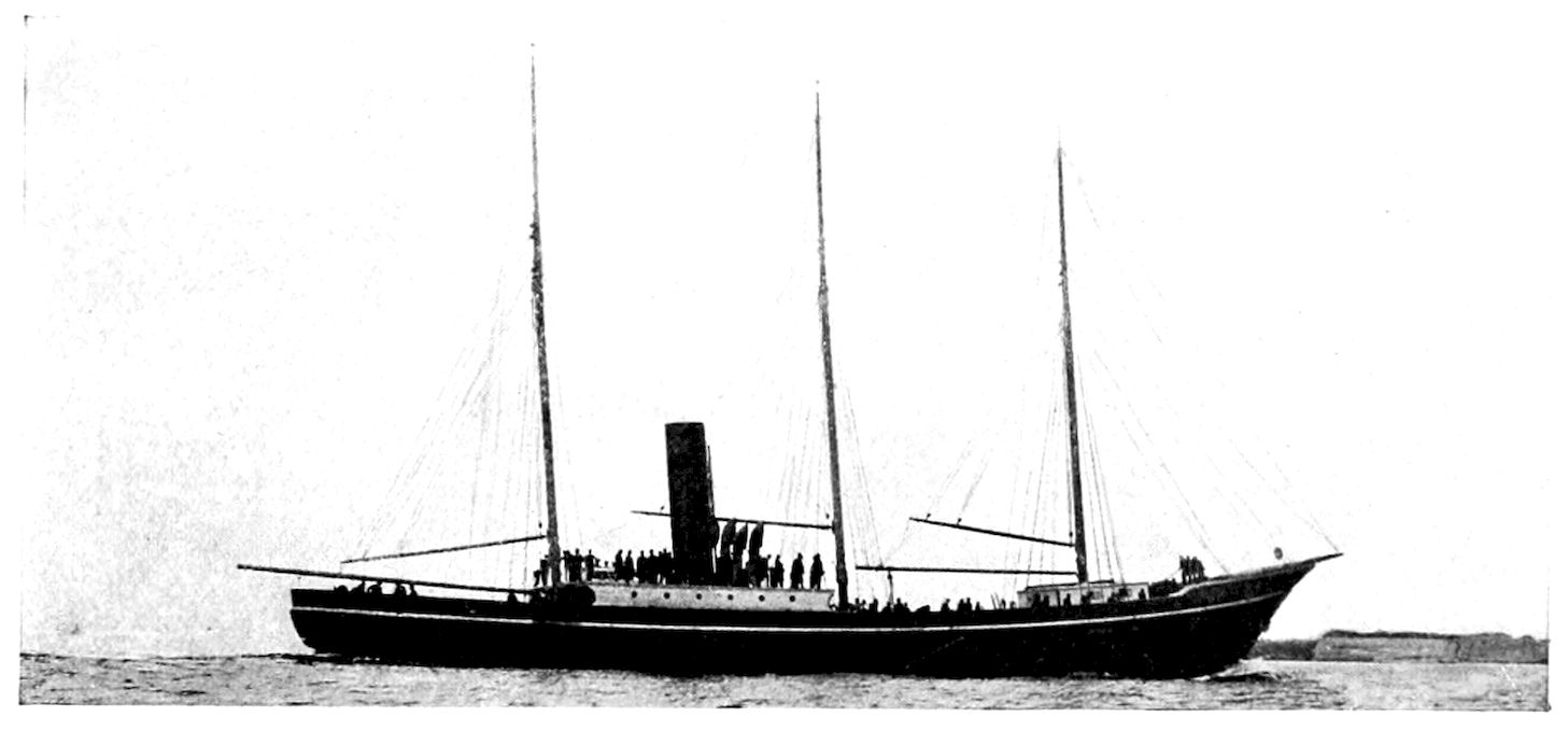 365The Roosevelt had engines capable of developing one thousand horse-power. They were of the inverted, compound type, driving a single eleven-foot propeller, and steam was supplied by two water-tube boilers and one Scotch boiler. Her sail plan is a light, American, three-masted schooner rig, possessing the advantage of light weight (it is to be remembered that every pound of weight saved in rigging or fitting means a pound of coal in the hold), and small surface to be forced through a head wind; yet sufficient to materially help the engines in a favouring wind, and to enable the ship to make her way home should her coal be exhausted.