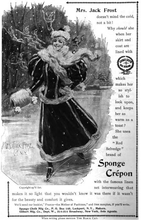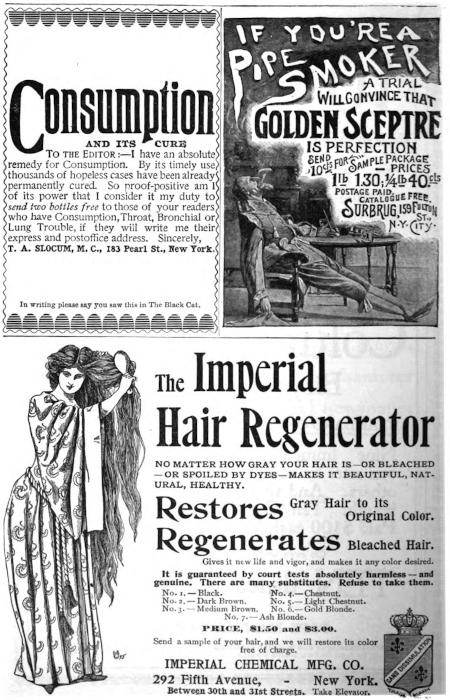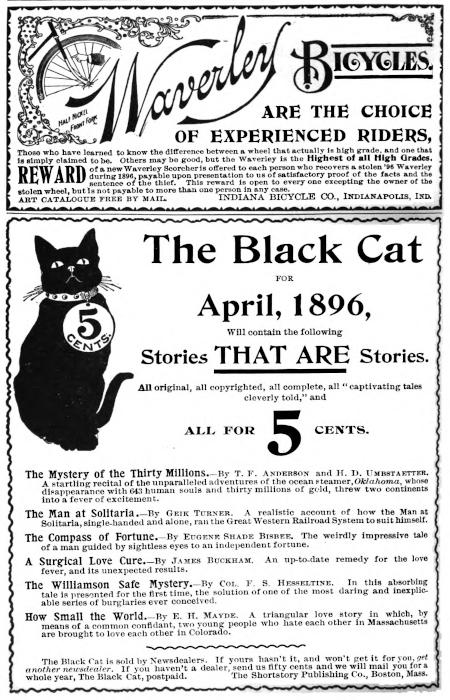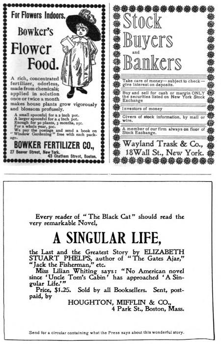 The Black Cat is sold by Newsdealers. If yours hasn’t it, and won’t get it for you, get another newsdealer. If you haven’t a dealer, send us fifty cents and we will mail you for a whole year, The Black Cat, postpaid. The Shortstory Publishing Co., Boston, Mass.