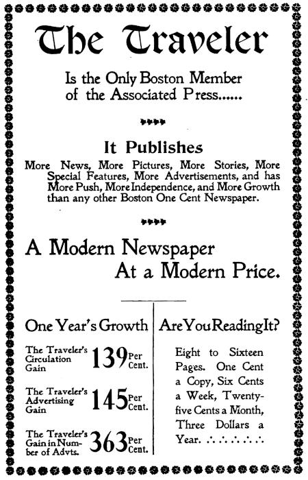 More News, More Pictures, More Stories, More Special Features, More Advertisements, and has More Push, More Independence, and More Growth than any other Boston One Cent Newspaper.
