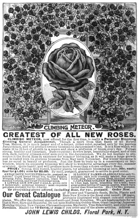 CLIMBING METEOR, now offered for the first time, is really a Perpetual Blooming Climbing General Jacqueminot. Though a sport from that finest of all Hybrid Teas, Meteor, it is much larger and of a deeper, richer color, equalled only by the peerless Jacqueminot, and will produce twenty blossoms to Jacqueminot’s one. It is a Rose which will make 10 to 15 feet of growth in a season and show a profusion of bloom every day. Foliage strong, healthy and luxuriant. Buds exquisite: flowers large, beautifully shaped, and of that rich, dark, velvety crimson color seen only in the Jacqueminot. We do not hesitate to pronounce it the finest Rose in existence for summer blooming, as it will make a large growth and is loaded with its glorious blossoms from May until November. For winter blooming it has no equal in beauty or profusion. Just the Rose to train up in a conservatory or bay-window, where its exquisite blossoms will show to wonderful advantage every day, summer or winter. Quite hardy, and will produce more flowers than a dozen ordinary Roses.