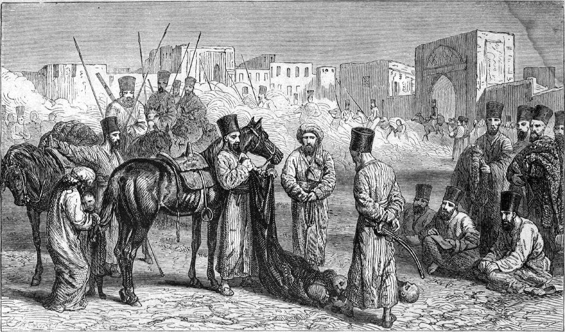 96) Régi s különös szokás Khivában, egész törzseket egyszerre s erőszakkal az országba telepiteni, s mindenféle segélylyel ellátni, hogy – miután az ilyenek bosszúja soha le nem hül – közelből őrizhetők legyenek.