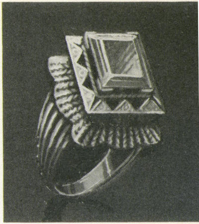 Among other practical uses of finger rings may be mentioned their use as money by the Gauls and other tribes of northern Europe. Women have had mirrors set in their rings, to give them constant glimpses of beauty—or a chance for quick repair. In eighteenth-century England and later—my grandfather wore one—were rings capped with a little hammer to press the tobacco down in pipes.