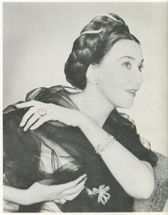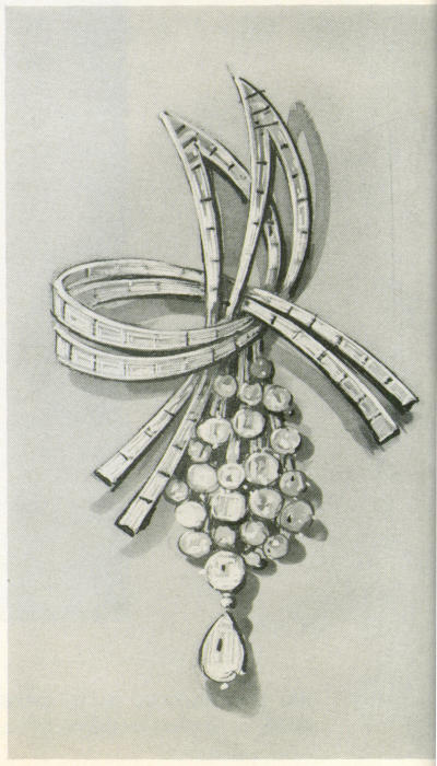 But at this point the story of the Sancy Diamond takes a double path. Sold to the Maharajah of Patiala and set in platinum, it remains part of the treasure of the land from which it first came. So goes the story. But either the Sancy diamond or a mysterious twin is worn by the former Nancy Langhorne of Virginia, now Lady Astor.