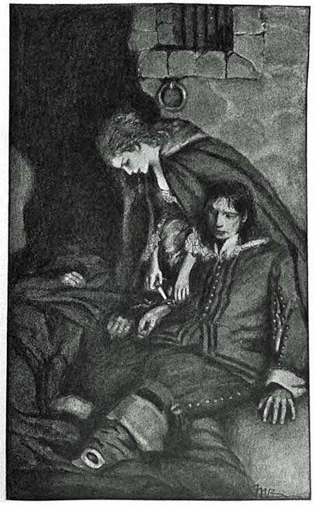 I was at her heels as she ran across the little court and plunged into a dark doorway beyond. I paused an instant to draw my sword, dropping my cloak that it might not cumber me, and then clattered up the stair behind her. It was dark and narrow and of many turnings, so that she, who knew the place, had reached the top while I was stumbling along midway, cursing the darkness. But she awaited me, and as I reached her side held out her hand to[15] me. My own closed over it in an instant and found it soft and warm and trembling. Here was an adventure after my own heart, and I had had so few adventures!