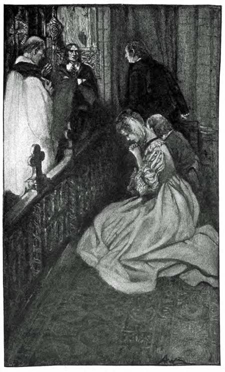 Once more I looked out into the church. I saw the acolyte arrange the altar-cloth and light the candles. Then the priest raised his hand, and the wedding-party advanced from the vestibule. It consisted only of Nanette, her uncle, and the hideous Briquet. The men held the girl between them and were almost carrying her. Her face was[371] white as death, and she turned her eyes appealingly from one to the other, but saw only ferocity in those two savage countenances. At last they were at the altar-rail, and she dropped to her knees and buried her face in her hands. I knew that she was praying.