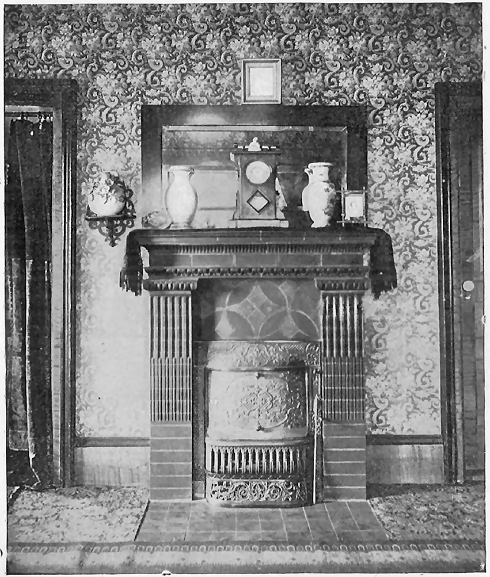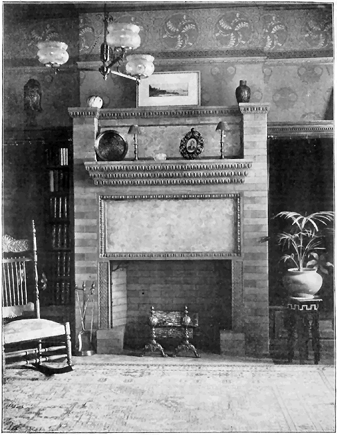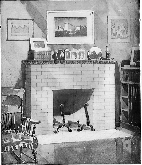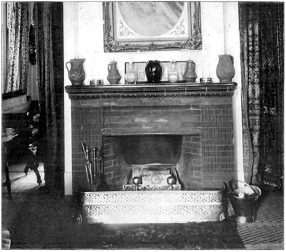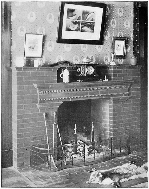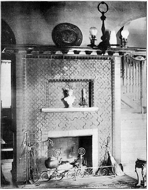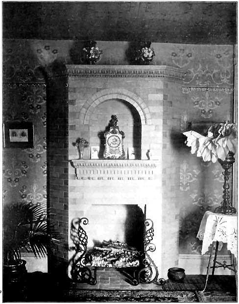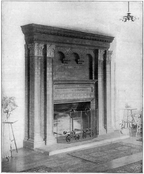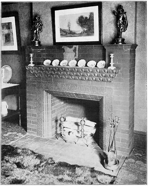 As to the choice of materials for the Fireplace Mantel, nothing has ever been used that meets all requirements so completely as our Ornamental Unglazed Brick. The essential idea of a fireplace is "Brick" from beginning to end, and the practice of using a brick facing with a wooden mantel around it (a practice which is now passing by) has only been a sort of makeshift, employed because Ornamental Brick of new and artistic patterns were not obtainable, our Company being the first to make them. There is always so much woodwork in a room, anyway, so why overcrowd the eye with a "mantelful" more? The glazed tiles which were formerly used in mantels were found to have such a cold, hard, and glassy look that they have been relegated to bathrooms, elevator shafts, sanitary uses, etc., to such an extent that few people now care to consider their use about the fireside.