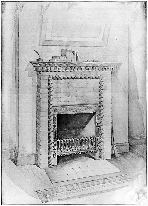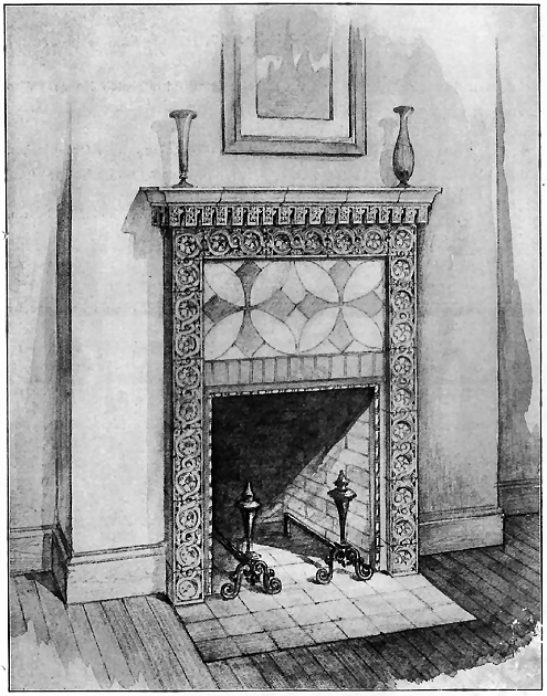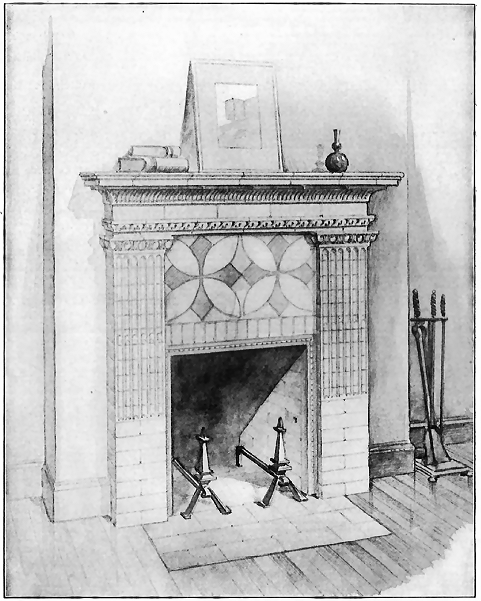 This design would require a width of 7 feet 6 inches, as the arched motif could not be used advantageously in a mantel of more than 8 inches less in width. The cornice to the mantle is of wood.