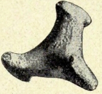 Im Laufe der Ausgrabungen stellte es sich heraus, dass-21- auch auf diesem Gebiete mancherlei Berührungspunkte zwischen dem modernen und alt-babylonischen Töpfergewerbe bestehen. Als besonders in die Augen springend hebe ich hervor, dass tönerne Dreifüsse, ähnlich denen, welche in den heutigen Porzellanfabriken (Abb. 10) dazu verwendet werden, die übereinander getürmten einzelnen Teller und Schalen während des Brennungsprozesses voneinander möglichst getrennt zu halten, bereits in der Nähe einer babylonischen Töpferei aus dem dritten Jahrtausend entdeckt wurden (Abb. 11). Spuren der drei Berührungspunkte jener Dreifüsse liessen sich namentlich auf vielen emaillierten Schalen der Partherperiode ohne Schwierigkeit nachweisen. Die Töpferei selbst lehnte sich an die NO.-Mauer des Tempelkomplexes und wurde von unseren Arabern gegen Ende der vierten Kampagne sofort als solche erkannt, da derartige primitive Öfen — als eine Kombination von Töpferei und Garküche — bis auf den heutigen Tag in Baghdâd, Hilla und Basra sich erhalten haben. Obwohl in sehr ruinenhaftem Zustande, liessen sich die ursprünglichen neun Bögen und Luftschächte noch nachweisen, so dass der Expeditionsarchitekt Fisher die ursprüngliche Anlage restaurieren und veranschaulichen konnte, in welcher Weise der Bau geheizt und ventiliert wurde.
