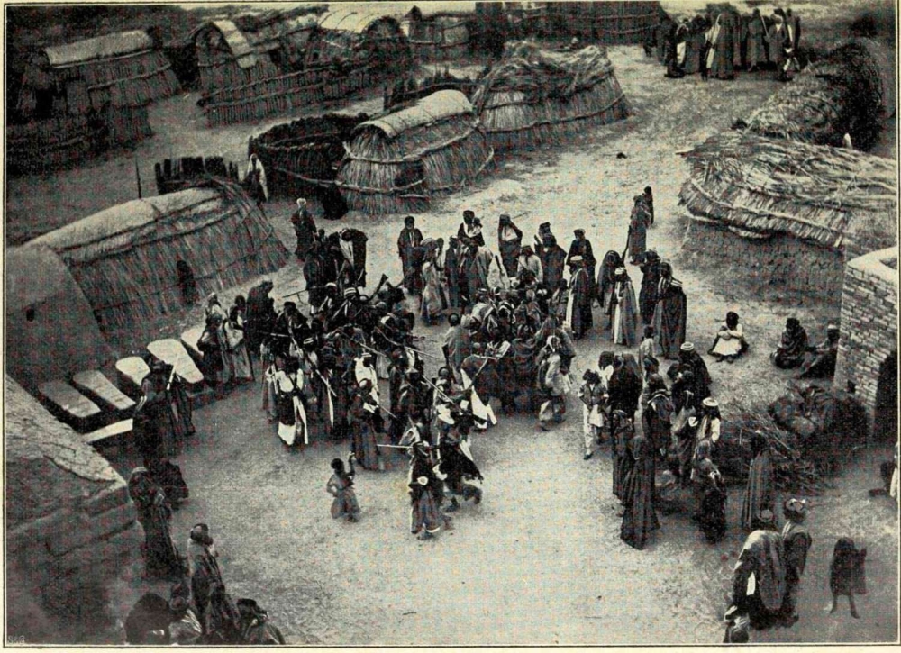 Unschöne, blau tätowierte Frauen mit grossen Nasenringen, halbnackte hagere Männer mit strähnenweis herabhängendem Haar, und schlechtgenährte, dickbäuchige Kinder, von der Sonne fast schwarz gebrannt, bewohnen diese unwirtlichen Gegenden. Von Schmutz und Ungeziefer starrende Hütten, sogenannte ṣerîfas (Abb. 3), gewähren ihnen dürftigen Schutz während der Nacht. Bei Tage durchkreuzen sie die Wasser in langen, schmalen Booten (ṭurrâdas) mit Hilfe der langen Bambusstange (merdî) und fangen Fische mit dem fünfzackigen Speere. Oder sie weiden an den Rändern des überschwemmten Gebietes ihre dürftigen Herden und lauern, mit Keule und Feuersteingewehr bewaffnet, im Hinterhalt auf Beute.