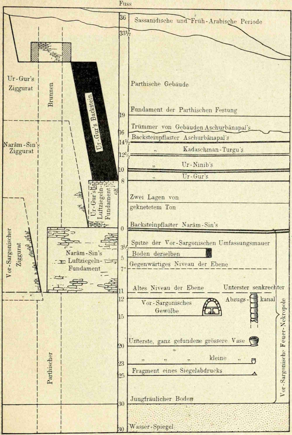 Wie viele Etagen der himmelanstrebende Turm ursprünglich gehabt hat, lässt sich wegen der in der Partherzeit daran vorgenommenen Veränderungen mit Sicherheit nicht sagen. Das unterste, von Kadaschman-Turgu um 3½ m nach N.O. hin erweiterte und von Aschurbânapal zum letzten Male restaurierte Stockwerk war etwas über 6 m hoch (Abb. 28). Spuren von zwei weiteren Etagen wurden im Innern der darüber lagernden Masse mit grosser Wahrscheinlichkeit nachgewiesen, während zu gleicher Zeit an den beiden Schmalseiten des rechteckigen Turmes die gewaltigen Abzugskanäle von Haynes blossgelegt wurden, welche die in ihrem Kerne aus ungebrannten Ziegeln -47-erbaute Stufenpyramide gegen die verheerenden Folgen der winterlichen Regen schützten (Abb. 29).
