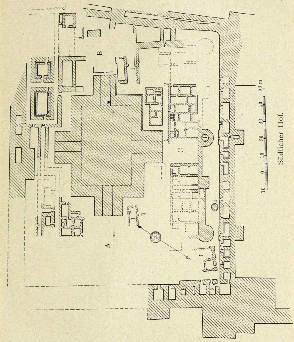 Daraus ergab sich als weitere Schlussfolgerung, dass der grosse offene Platz im N. des Tempels nicht als vor dem letzteren, sondern als hinter demselben gelegen verstanden werden muss, dass demgemäss der Haupteingang zum Heiligtum im SO. zu suchen ist, während der weite Platz mit dem-13- westlich daran grenzenden grösseren Hügelrücken sekundären Zwecken, Stallungen für Herden, Lagerplätzen für Pilger, Wirtschaftsräumen, Wohnungen der untersten Beamten u. s. w. gedient zu haben schien.