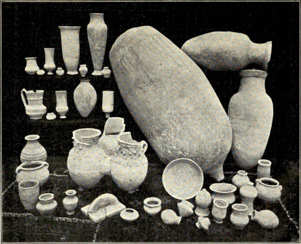 Die meist den Gräbern und Totenurnen entnommenen kostbaren Geräte und Schmucksachen (Abb. 9) aus verschiedenen Steinen, Kupfer, Bronze, Silber und Gold betragen mehr denn ½ Centner, wobei die zahlreichen Silbermünzen der älteren griechischen und parthischen Periode und sogar aus noch späterer Zeit völlig unberücksichtigt geblieben sind. Mehrere hundert Silbermünzen aus der Zeit der ‘Omajjaden- und ‘Abassiden-Kalife, von denen Hârûn er-Raschîd der bekannteste ist, wurden in den Abhängen der Hügel in zwei grossen Nestern gefunden. Von den massenhaft vorkommenden nachbabylonischen Ton-Särgen, welche meist ohne jegliche Ordnung über- und nebeneinander (vgl. S. 37) angetroffen werden, haben wir ca. 2500 näher untersucht. Noch wichtiger waren die Totenurnen ans der ältesten vorhistorischen Zeit, die in Verbindung mit Tausenden von Tonvasen aus allen Jahrhunderten babylonischer Geschichte unsere Kenntnis von der allmählichen Entwicklung der Keramik im Zweistromlande ein gut Teil fördern werden.