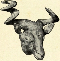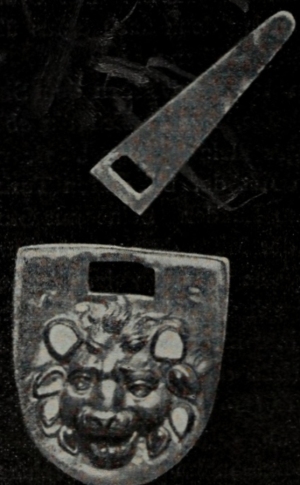 Aber verlassen wir die an Interessantem und Lehrreichem nicht minder als an Rätselhaftem noch so reiche Partherzeit. Die Ruhestätten der Toten begegnen uns bereits neben den Wohnungen der Lebendigen, bald in den Abhängen der Hügel, bald unter den Häusern der Bevölkerung, und zwar sind es meistens aus älteren Backsteinen hergestellte Gewölbebauten, welche oft eine ganze Anzahl Leichen bergen. Eines dieser Gräber (unterhalb des Bodens von Zimmer Nr. 3 auf dem Plane der obigen Partherfestung, S. 31) war glücklicherweise der Plünderung in alter Zeit entgangen. Es enthielt reichen Goldschmuck, nämlich zwei ursprünglich die Gesichter der Verstorbenen bedeckende Goldplatten von je ca. 15 cm im-36- Geviert, zwei ca. 30 cm lange Stirnbänder, zwölf Rosetten, vier glockenförmige Ornamente, 48 kleine Goldknöpfe, einen goldenen Ohrring, zwei mit Rubinen und Türkisen besetzte Sandalenschnallen (Abb. 21), Löwenköpfe im Relief darstellend, sowie eine Goldmünze des römischen Kaisers Tiberius, wodurch das Alter des Grabes mit grösserer Sicherheit als gewöhnlich bestimmt werden konnte.