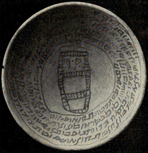 Wie bereits kurz angedeutet wurde, ist die früharabische Periode mit ihren kûfischen Kupfer- und Silbermünzen und den zahlreichen hebräischen und mandäischen Zauberschalen gerade in Nippur oder, wie der Ort allmählich gesprochen wurde, Niffer und wegen des folgenden Labials schliesslich Nuffar, sehr gut vertreten. Ein grösserer Krug mit kurzer arabischer Inschrift gehört ebenfalls diesem allgemeinen Zeitabschnitt an. Das Innere der Zauberschalen ist in der Mitte entweder leer oder mit kabbalistischen Zeichen, umgeben von einer Schlange oder einem einfachen Kreise, noch öfter aber mit einem recht secessionistisch aussehenden Dämon, der uns lebhaft an die Bilderbogen von „Max und Moritz‟ erinnert, geschmückt (Abb. 25), während Lilith und andere böse Geister, welche die Lebenden mit Krankheit und-40- Unglück plagen und die Toten selbst im Grabe noch beunruhigen, „im Namen Jehovahs‟ durch eine spiralförmig die Schale bedeckende Inschrift beschworen werden.