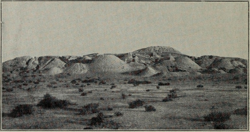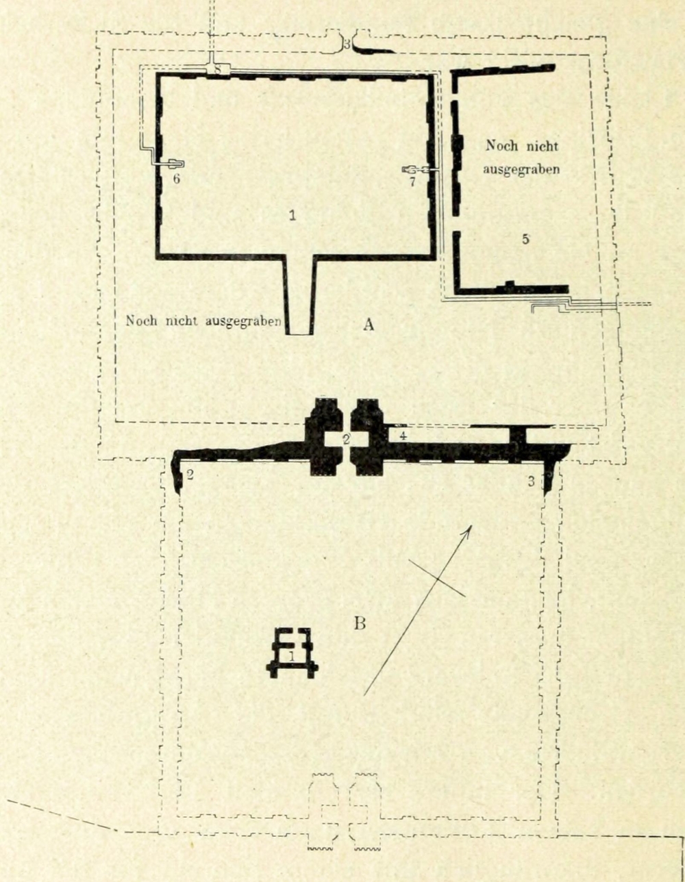 [3] In dem von mir für den Palast des patesi ausgesonderten grossen östlichen Hügel konnten noch nicht genügende Ausgrabungen wegen der darauf lagernden gewaltigen parthischen Bauten vorgenommen werden. Jedoch sind bereits eine uralte Toranlage und Wasserleitung in der Umfassungsmauer nebst einer Anzahl grosser Keilschrifttafeln durch Versuchsschächte zu Tage gefördert worden, so dass alle Anzeichen dafür sprechen, dass tatsächlich ein grosses Gebäude hier begraben liegt.