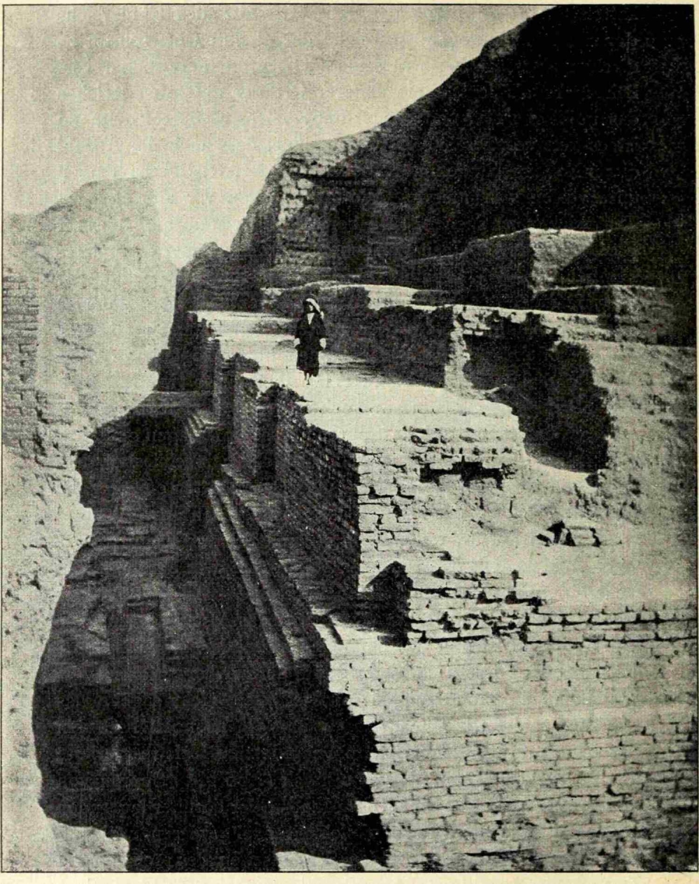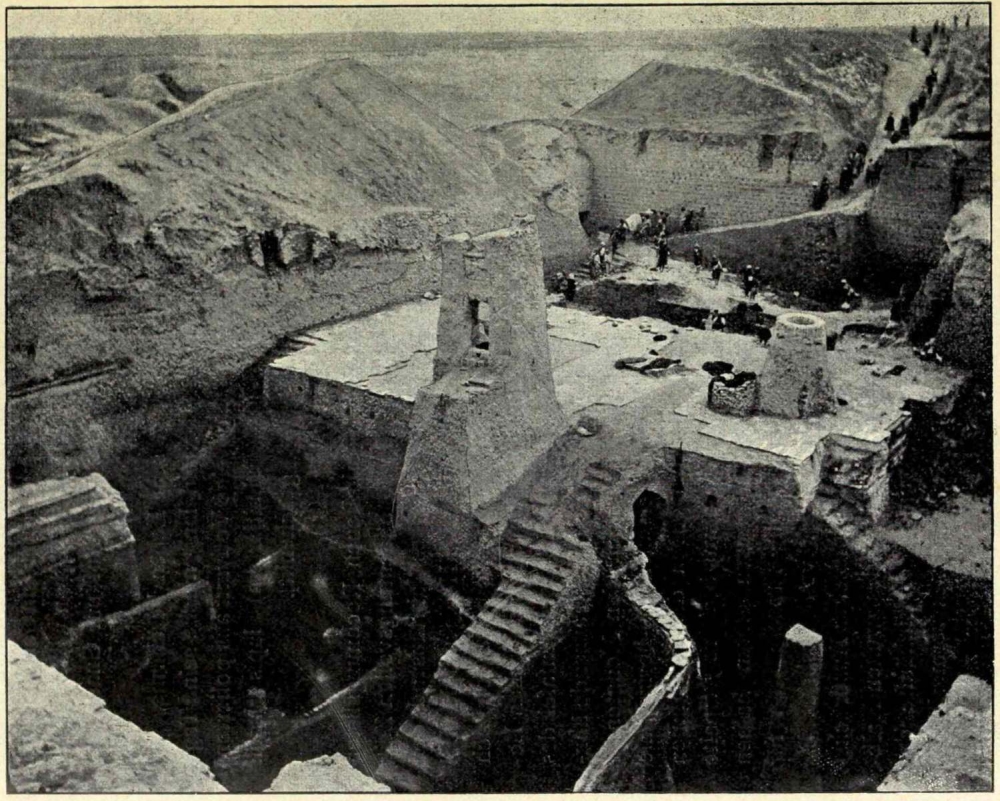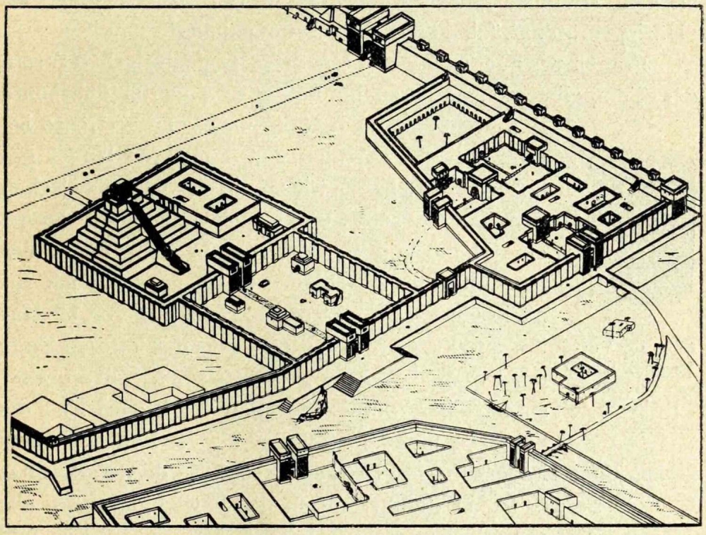 Der Etagenturm des Bêl ist durch vier gewaltige Seitenflügel-32- erweitert und in eine fast uneinnehmbare Citadelle verwandelt. Ein 21 m tiefer Brunnen, durch die kompakte Masse gegraben, versorgt die Besatzung mit Wasser. Aus drei Jahrtausenden zusammengewürfelte Backsteine der Könige Ur-Gur (ca. 2700 v. Chr.), Kadaschman-Turgu (ca. 1300 v. Chr.) und Aschurbânapal (668-626 v. Chr.) bilden seine Umrahmung. Und rings um dieses weit in die Lande schauende Bollwerk gruppiert sich ein verhältnismässig wohlerhaltener Palast. 18 m hoch und (je nach der Höhe) 9 bis 12 m dick stehen die äusseren Mauern noch da. Über dem alten Eingang des Tempels erhebt sich ein massiver Turm zum Schutze der Bewohner. Die steil in die Ebene abfallende westliche Ecke ist von den winterlichen Regen zum grössten Teil hinweggeschwemmt und vernichtet.