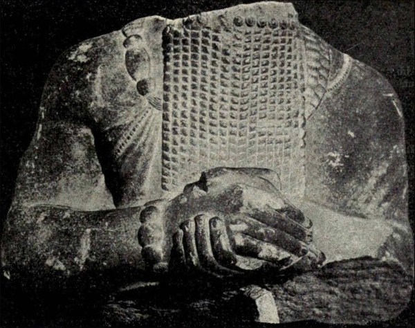 Die älteren Kunstdenkmäler aus dem 3. und 4. Jahrtausend sind namentlich durch Grabungen der dritten und vierten Kampagne bedeutend vermehrt worden. Sie entstammen der Regel nach einer verhältnismässig flachen Schicht, nämlich den Trümmermassen des Tempelhofes zwischen der dritten und vierten Plattform (Abb. 31). Eines der grössten und besterhaltenen Werke ist der Torso einer Statue in Dolerit, ⅔ Lebensgrösse, ca. 2700 v. Chr. Im Gegensatz zu den bekannten Tellôstatuen ist der Priesterfürst hier bärtig und mit Hals- und Armschmuck dargestellt. Er ist offenbar ein Semit. Der Bart zeigt bereits (Abb. 32) die aus den spätassyrischen Monumenten des 9.-7. Jahrhunderts wohlbekannte konventionelle Wiedergabe des Flechtens. Im übrigen bewundern wir den ersten schüchternen Versuch des babylonischen Künstlers, die Falten des nachlässig umgeworfenen Shawls zum Ausdruck zu bringen, das Anschwellen der Muskeln am rechten Oberarm und die-52- sorgfältig ausgearbeiteten Nägel der schlanken Finger. Um etwa 100 Jahre älter ist der mit der wollenen Kopfbedeckung geschmückte Marmorkopf eines sumerischen patesi aus dem Süden (Abb. 33).