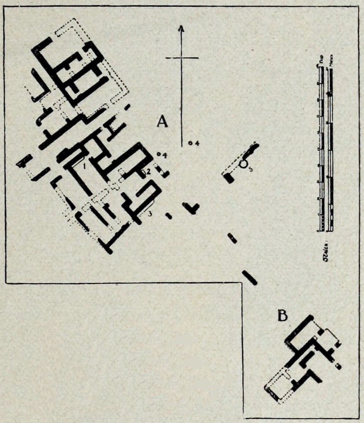 Gleich dem darunter liegenden babylonischen Heiligtume bestand dieser umfassende parthische Bau (Abb. 18) aus zwei aneinander grenzenden Höfen. Der südliche ist auf dem Plane unten nur eben angedeutet. Die äussere Befestigungsmauer des nördlichen Hofes, etwa 168 m lang, war auf drei Seiten mit Baracken für die Soldaten, mit Gefängnissen und Kornspeichern dicht besetzt. Durch einen Korridor von der ersten Mauer getrennt, erhob sich eine zweite von ungleicher Stärke. Unmittelbar dahinter befinden sich (mit C angedeutet) die Wirtschaftsräume und die Zimmer der Dienerschaft, welche durch eine parallel mit der Front des alten Etagenturmes laufende, gut kanalisierte Strasse (2) im NO. von den grossen Empfangszimmern des Kommandanten (B), im NW. dagegen vom Harem oder den Familiengemächern (A) getrennt waren. Etwa zwei Drittel vom ganzen Komplexe sind untersucht worden. Der Haupteingang war zweifellos nahe der noch nicht genügend durchforschten nördlichen Ecke. Reste einer in etwas anderem Winkel zum Etagenturm gerichteten älteren (Seleuciden?) Festung — im Plane durch I gekennzeichnet — liegen 1½ bis 2 m unterhalb dieses parthischen Palastes. Dreimal wurden die Türen und Wände der Zimmer und Korridore des jüngeren Baues wegen der ständig wachsenden-33- Schmutzablagerungen beträchtlich erhöht, wie dies aus den erhaltenen oberen Resten der Prüfungssäule noch einigermassen hervorgeht, so dass vier Perioden in genannter Festungsanlage mit Sicherheit nachgewiesen werden können. Die für diese ganze Zeit von 4-500 Jahren charakteristischen Formen von Terrakotta-Vasen werden durch die beifolgende Illustration im grossen und ganzen veranschaulicht (Abb. 19).