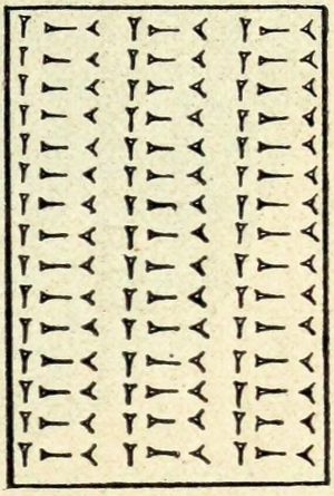 Unter den ausgegrabenen Räumen nehmen die Unterrichtszimmer, in denen die Studierenden die Kunst des Tafelschreibens erlernten und in die einzelnen Zweige babylonischen Wissens eingeführt wurden, eine hervorragende Stelle ein. Ein wunderbares Bild eifrigen Lehrens und Lernens entrollt sich vor unseren Augen. Der Schüler erhielt zunächst Anweisung, wie er Tontafeln anzufertigen hatte. Eine ganze Anzahl zum Teil recht ungeschickt ausgeführter, unbeschriebener Tafeln legt davon Zeugnis ab. Dann ging es an das Einüben der drei Grundelemente, aus denen die Keilschrift besteht. Zunächst wurde jedes für sich (Abb. 38) geschrieben, dann alle drei nebeneinander (Abb. 39) wiedergegeben — ganz nach der Weise unseres heutigen assyrischen Unterrichts — bis der babylonische „Professor‟ mit der Leistung zufrieden war. Waren die ersten Schwierigkeiten überwunden, so wurden die einfachen Silbenzeichen ohne Rücksicht auf Inhalt eingedrillt. Der Schüler hatte sie nach einem gewissen Systeme so zusammenzustellen, dass dasselbe Zeichen in erster Stelle beibehalten wurde, und damit zunächst die leichteren und später die mehr komplizierten verbunden wurden. So las ich auf einer dieser Übungstafeln: 1. ba-a 2. ba-mu 3. ba-ba-mu 4. ba-ni 5. ba-ni-ni 6. ba-ni-ia 7. ba-ni-mu. Auf einer andern, bereits etwas schwierigeren heisst es: 1. za-an-tur 2. za-an-tur-tur 3. za-an-ka 4. za-an-ka-ka 5. za-an-ka-a 6. za-an-ka-mu, usw. Auf einer derselben hatte der Student nicht weniger denn 4 Fehler auf 5 Zeilen gemacht. Ob es dafür Nachsitzen oder den Stock gab, kann ich heute noch nicht verraten.