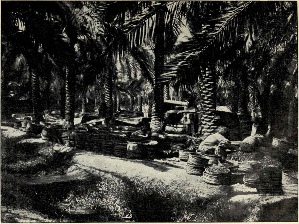 Rastlos umherschweifende Nomaden im Norden und Süden, und stumpfsinnige Sumpfbewohner im Zentrum des Landes sind die Erben des zertrümmerten Reiches Nebukadnezars. Welch ein Kontrast zwischen alter Zivilisation und heutiger Degeneration! Einst, so weit das Auge reichte, üppige Palmenhaine (Abb. 4), wogende Ährenfelder, bewässert mit den oft in den Inschriften erwähnten Schöpfanlagen (jetzt genannt čereds), blühende Städte und Gehöfte, das Land, das wir so gern als die Wiege der Menschheit bezeichnen, wo Wissenschaft und Kunst geboren, und jetzt — ein offenes Land Nod (1. Mose 4, 16), wohin Deserteure und Verbrecher sich flüchten, eine Stätte der Verwüstung und Unwissenheit, das Eldorado von Räubern und Mördern.