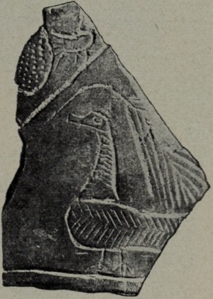 Unterziehen wir zunächst die 6 nachbabylonischen Strata mit ihrem seltsamen Gemisch von 12-1300jähriger Geschichte einer kurzen Prüfung, so ergibt sich als hauptsächlichstes Resultat die charakteristische Tatsache, dass bald nach der Rückkehr Alexanders des Grossen aus Indien und seinem-30- vorzeitigen Tode im Palaste Nebukadnezars am Euphrat, also etwa um 300 v. Chr., der Tempel des Bêl als Heiligtum aufhört zu existieren. Hellenistischer Einfluss lässt sich allenthalben spüren, an den Mustern von Friesen, an dem Medusenhaupte auf einer schönen braunemaillierten Lampe (Abb. 17), an den gefälligen Formen von dünnwandigen Terrakotta-Vasen, an eigentümlichen langstieligen Vasen, Fläschchen, Schalen usw. aus Glas, an rhodischen Krügen mit griechisch gestempelten Henkeln, an den häufiger werdenden hohlen Terrakotten mit einem Überzug aus weisser Paste, den faltigen Gewändern der Frauen, den erotischen Darstellungen, selbst an dem Spielzeug der Kinder und den Klappereiern (Hühner, Trommeln, Puppen u. s. w.) der Säuglinge.